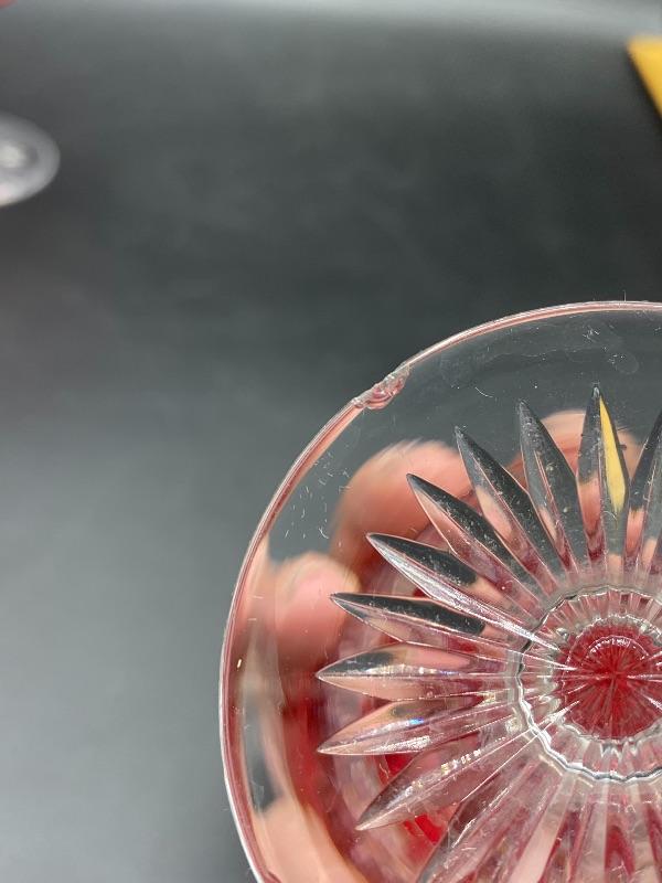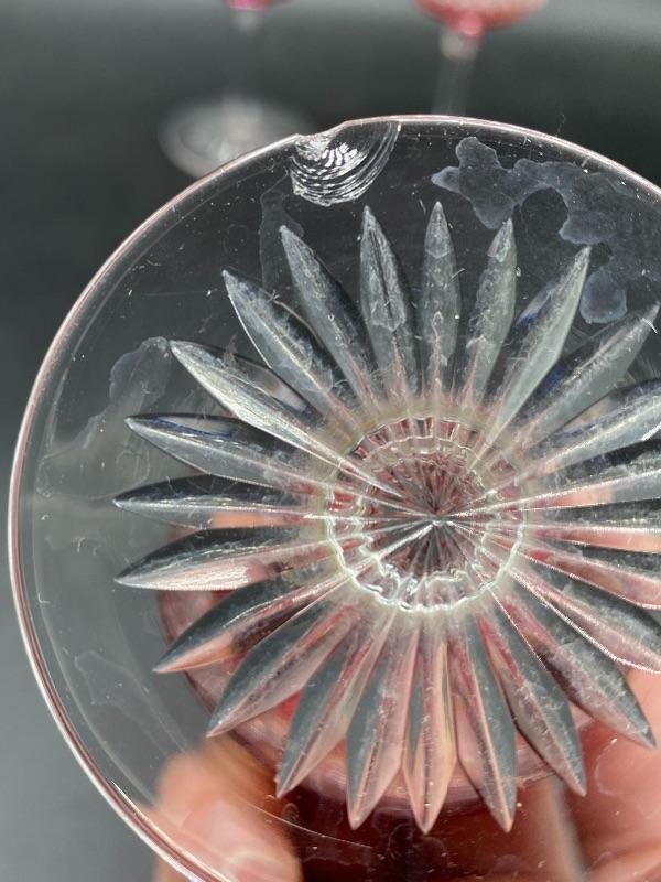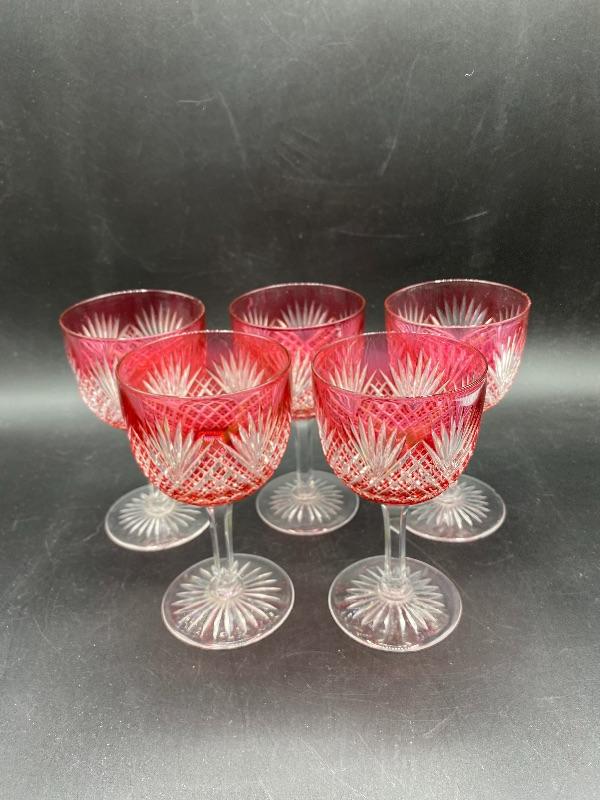 Set of 5 cut crystal small goblets. Cranberry cut to clear. About 5" size. There are two glasses with chips in the bottom edge.