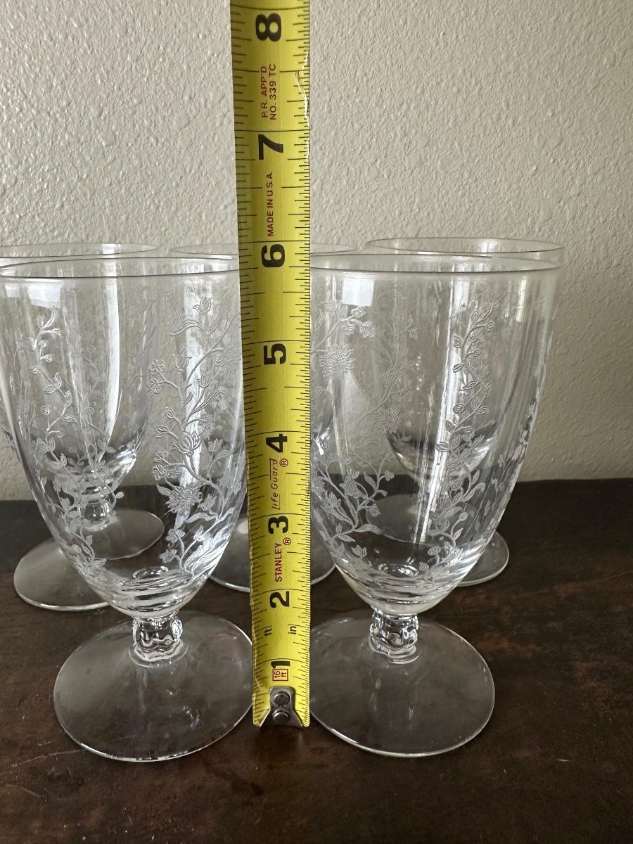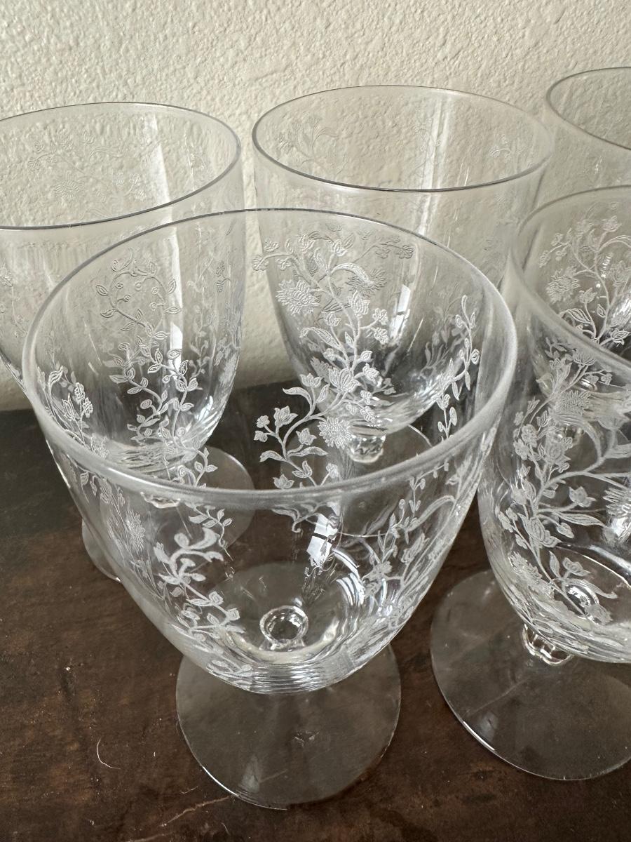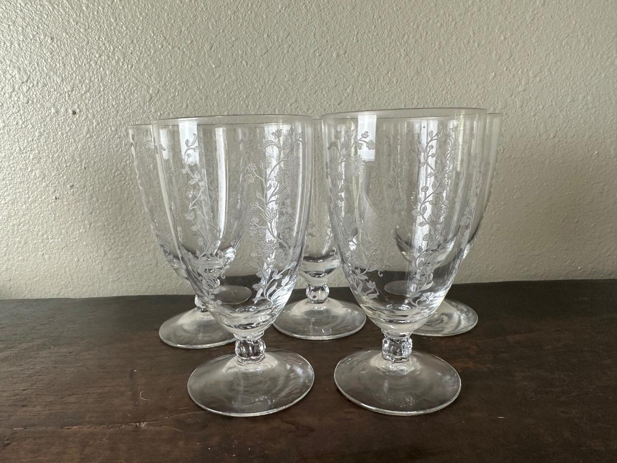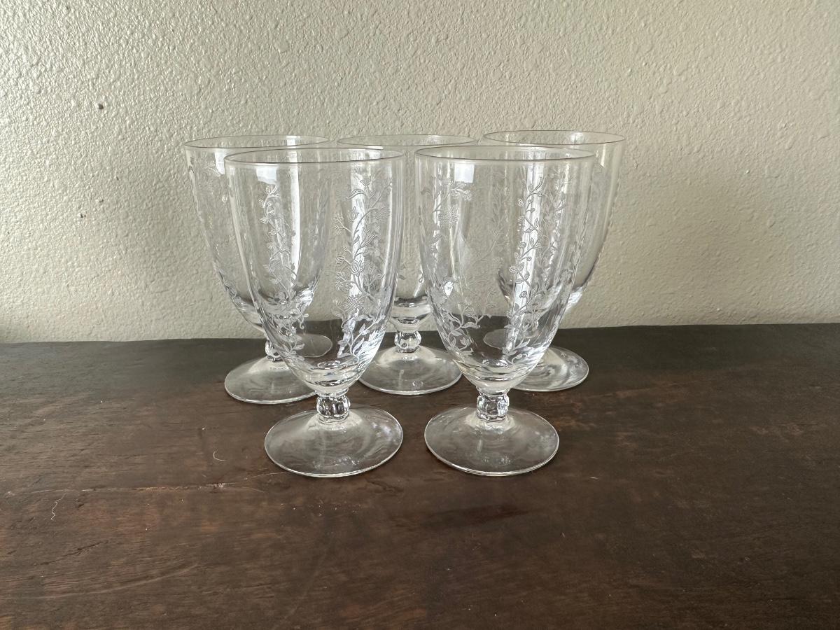 A set of five clear glass goblets, each featuring an elegant etched floral and vine design.