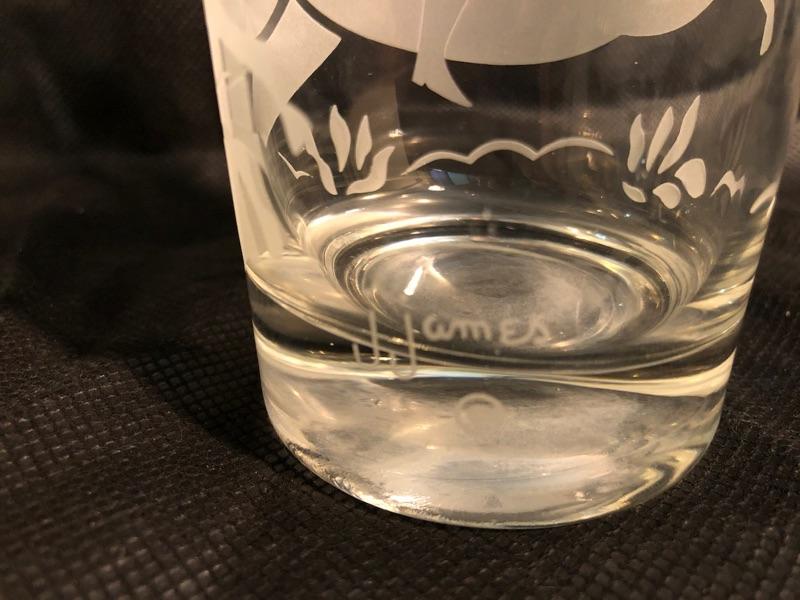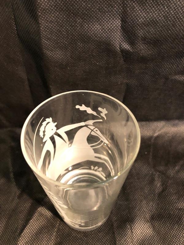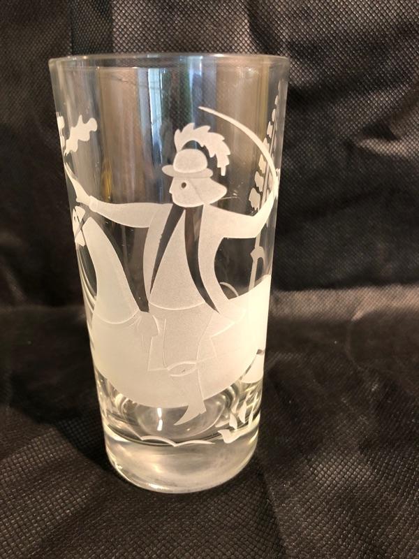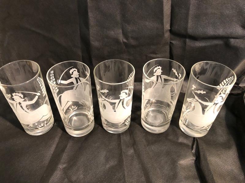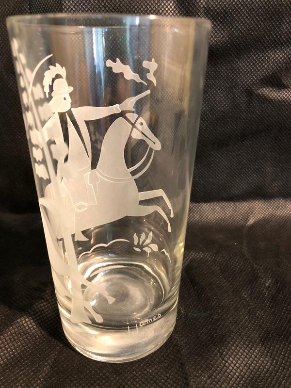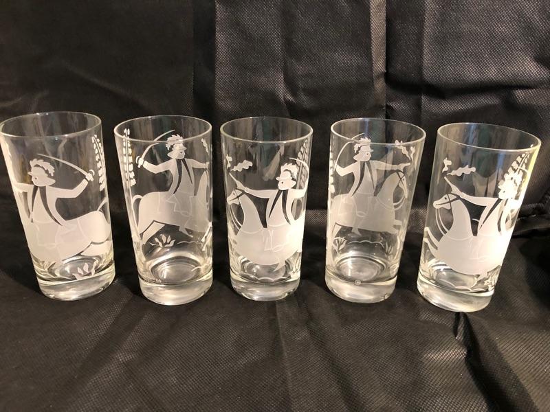 Set of 5 etched horseman highballs by J. James 6in tall x 2.75in diameter