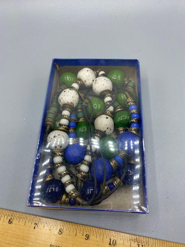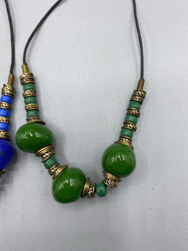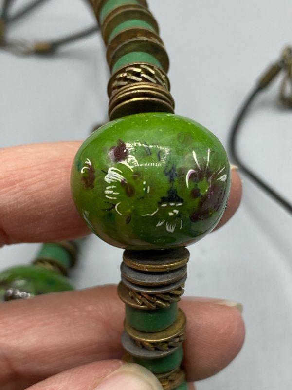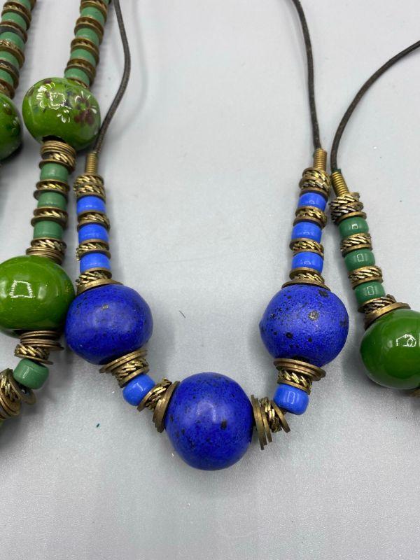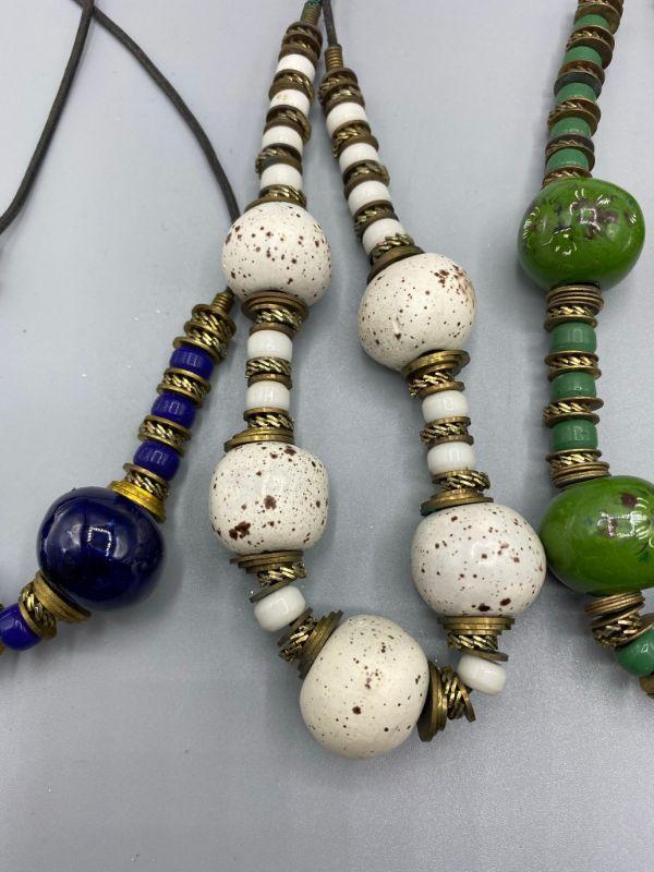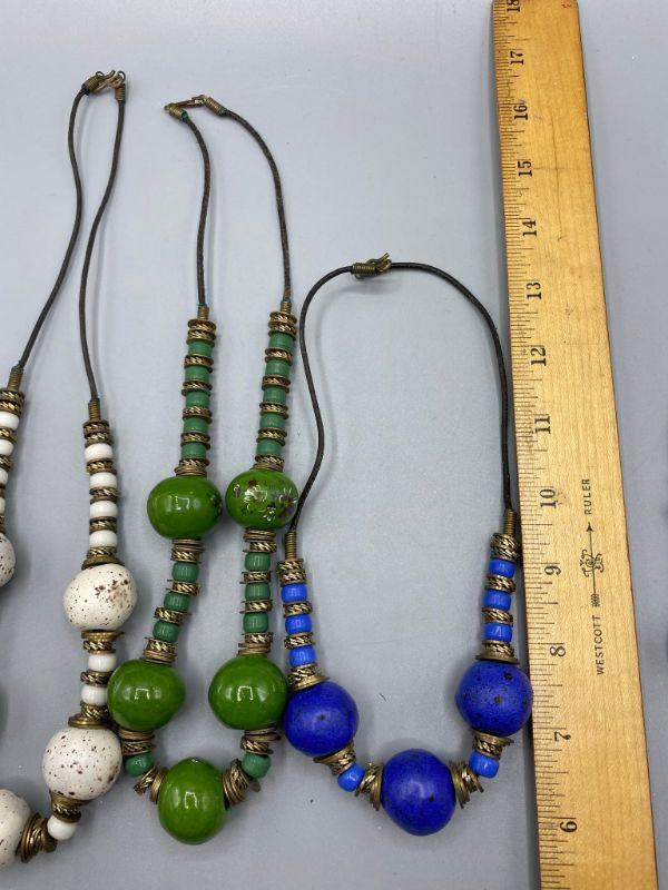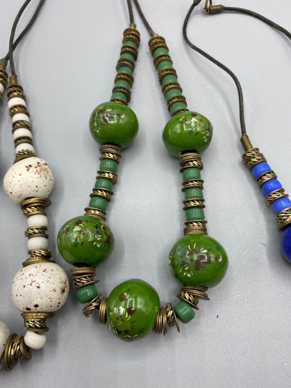 Set of 5 similar necklaces. Different colors but similar styles. Beads are glazed clay, maybe ceramic. Metal findings between. One of the green necklaces has a floral design on the large beads. Origin unknown, possibly homemade.