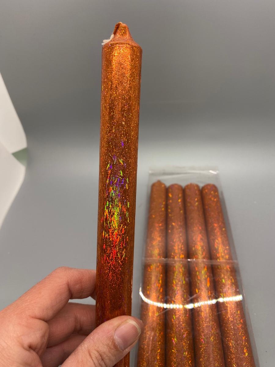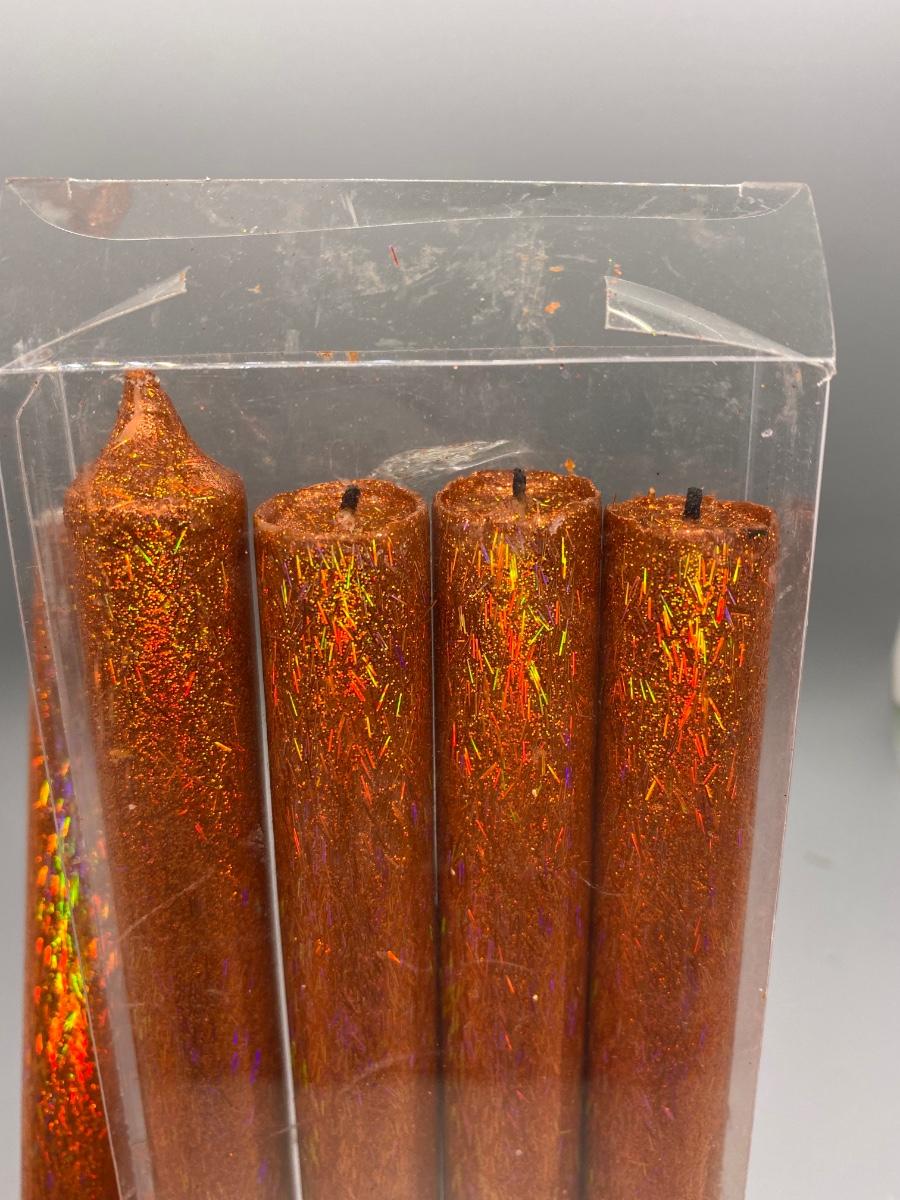 Set of 5 Glitter Metallic Orange Taper Candles. A couple have been used, but very little, still a lot to burn.