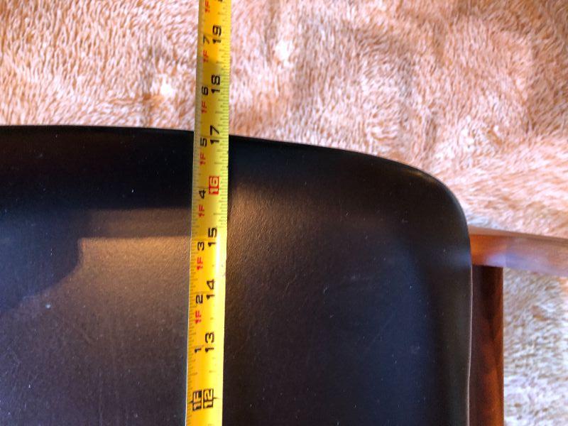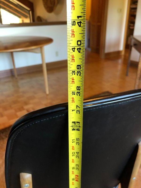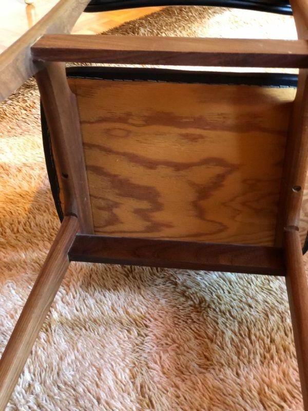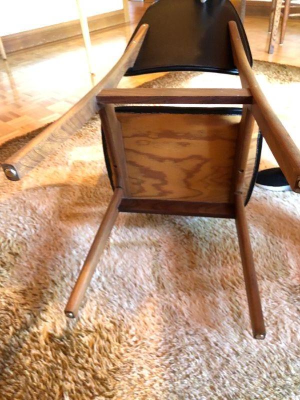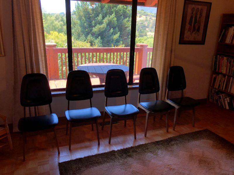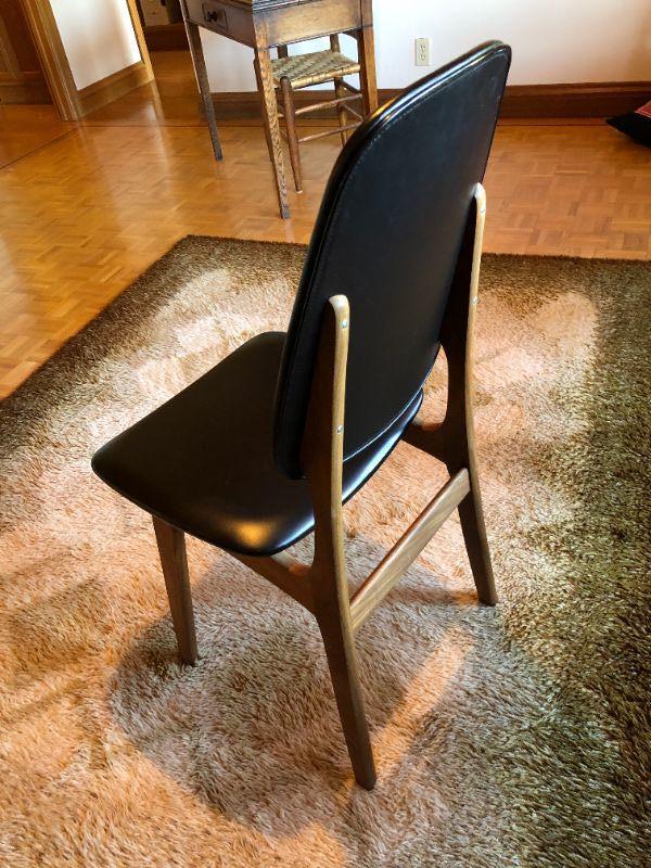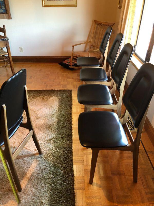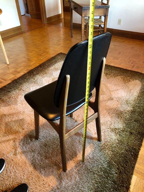 5 beautiful hand crafted mid century modern wood and black leather (or faux leather) dining chairs. In excellent, like-new condition. No signatures, potentially made by the talented estate owner (he made the dining table and much of the wood furniture in the home, so it would not be surprising!).
