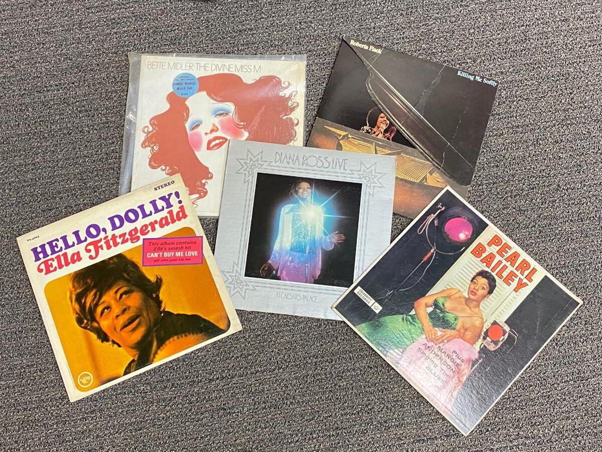 Set of 5 record albums from great female artists. Bette Midler, Ella Fitzgerald, Diana Ross, Pearl Bailey, and Roberta Fleck. Untested.