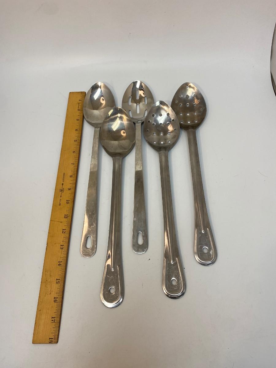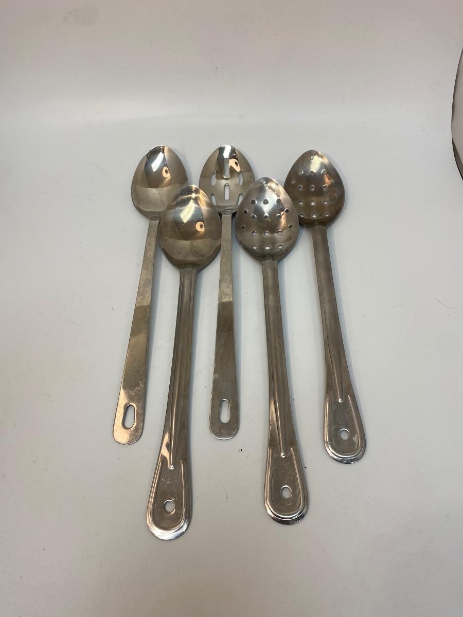 Set of 5 Large Metal Serving Spoons. Three of the spoons are slotted. Good used conditions. About 13" length.