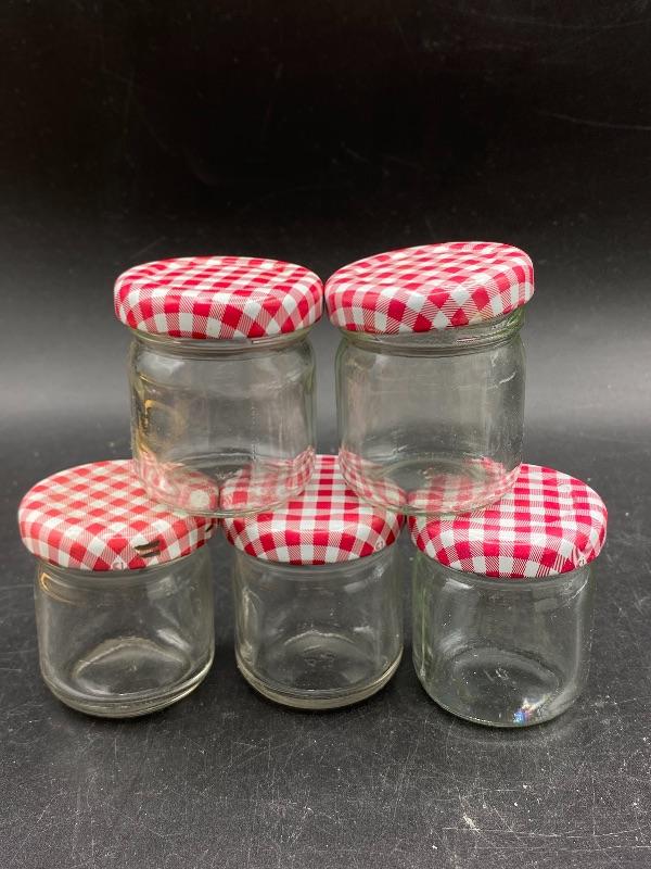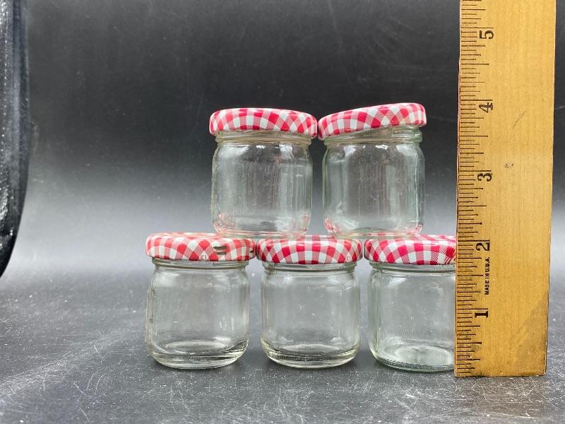 Set of 5 mini jelly jars with red checkered lids. Good Condition. Great for crafts or organization of small items like beads. About 2" tall with lid.