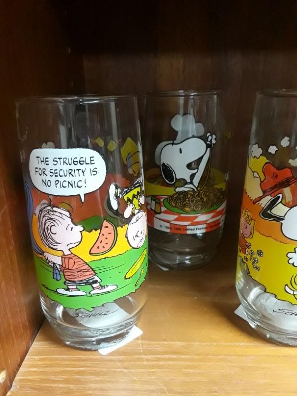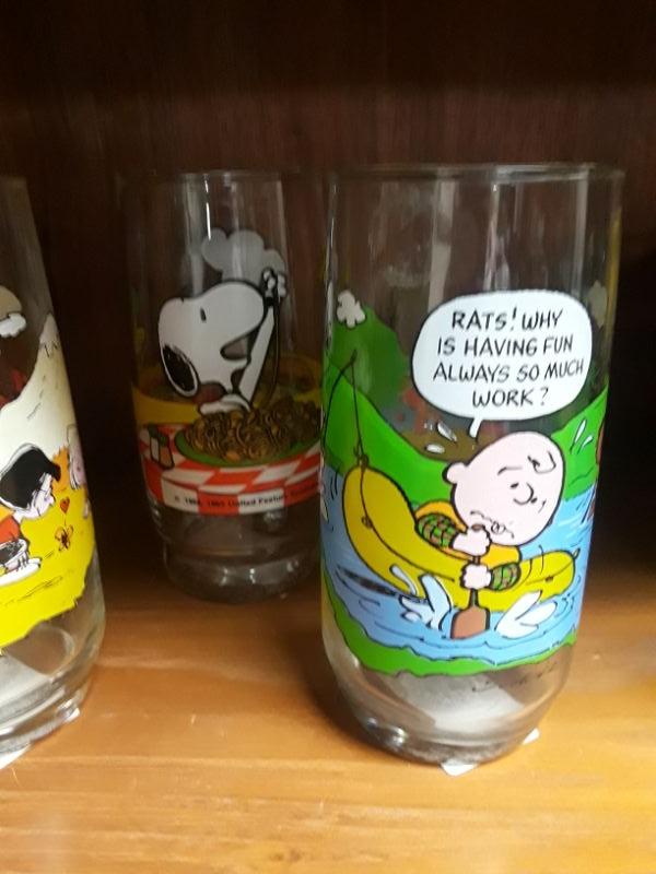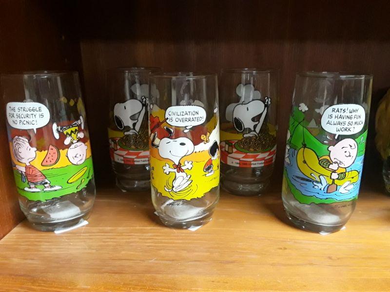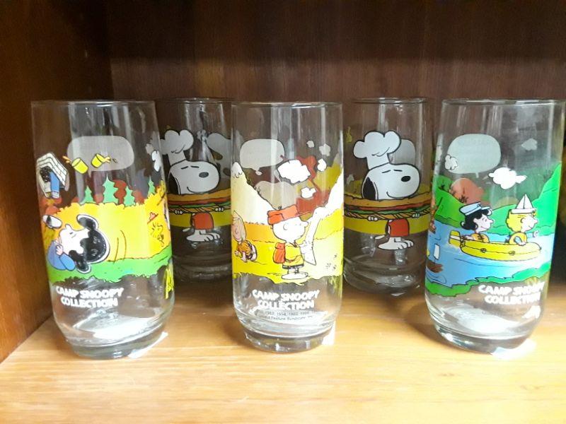 Set of 5 Vintage Snoopy & the Peanuts gang Drinking Glasses. 4 Different patterns. 3 are from the Camp Snoopy Collection released by McDonalds. The other 2 are identical and are of Snoopy with food. Great Vintage Condition