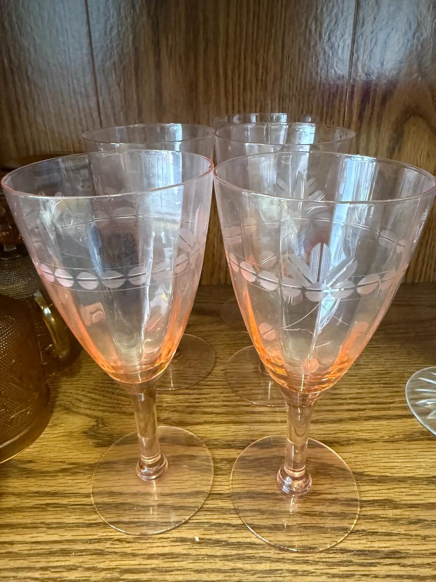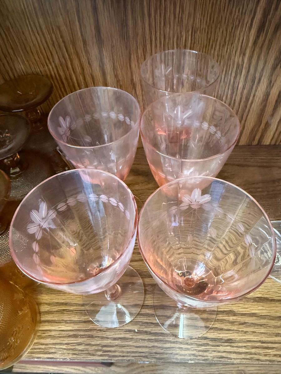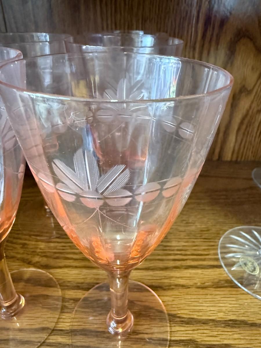 A beautiful set of 5 pink depression glass wine glasses with etched designs, ideal for adding a vintage charm to your glassware collection.