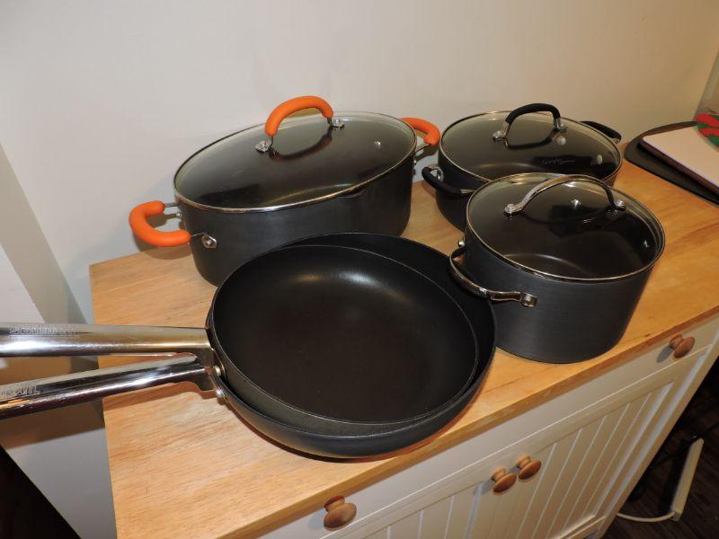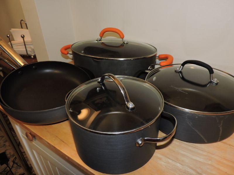 Set of 5 Pots and Pans ““ Including Rachel Ray Covered Oval Pasta Pot, three with lids. Very Good Condition. **Please read Terms and Conditions before placing a bid. Pick up is Thursday, August 15, 2019 from 4pm to 7pm or Sunday, August 18 from 11am-2pm in Mullica Hill. All sales are final. All sales are as is, where is. Please review all photos. Any props included in photos are not included in listing. All measurements are approximate.