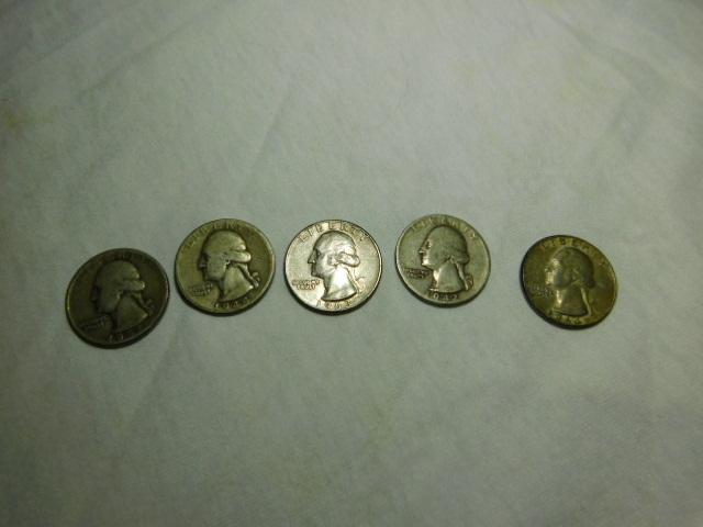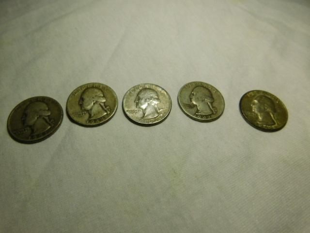 Set of 5 Pre-1964/1964 Silver Washington Quarters Circulated