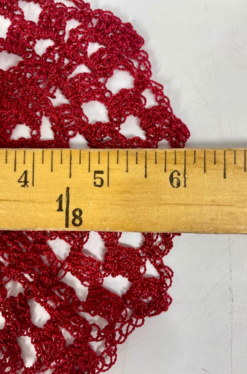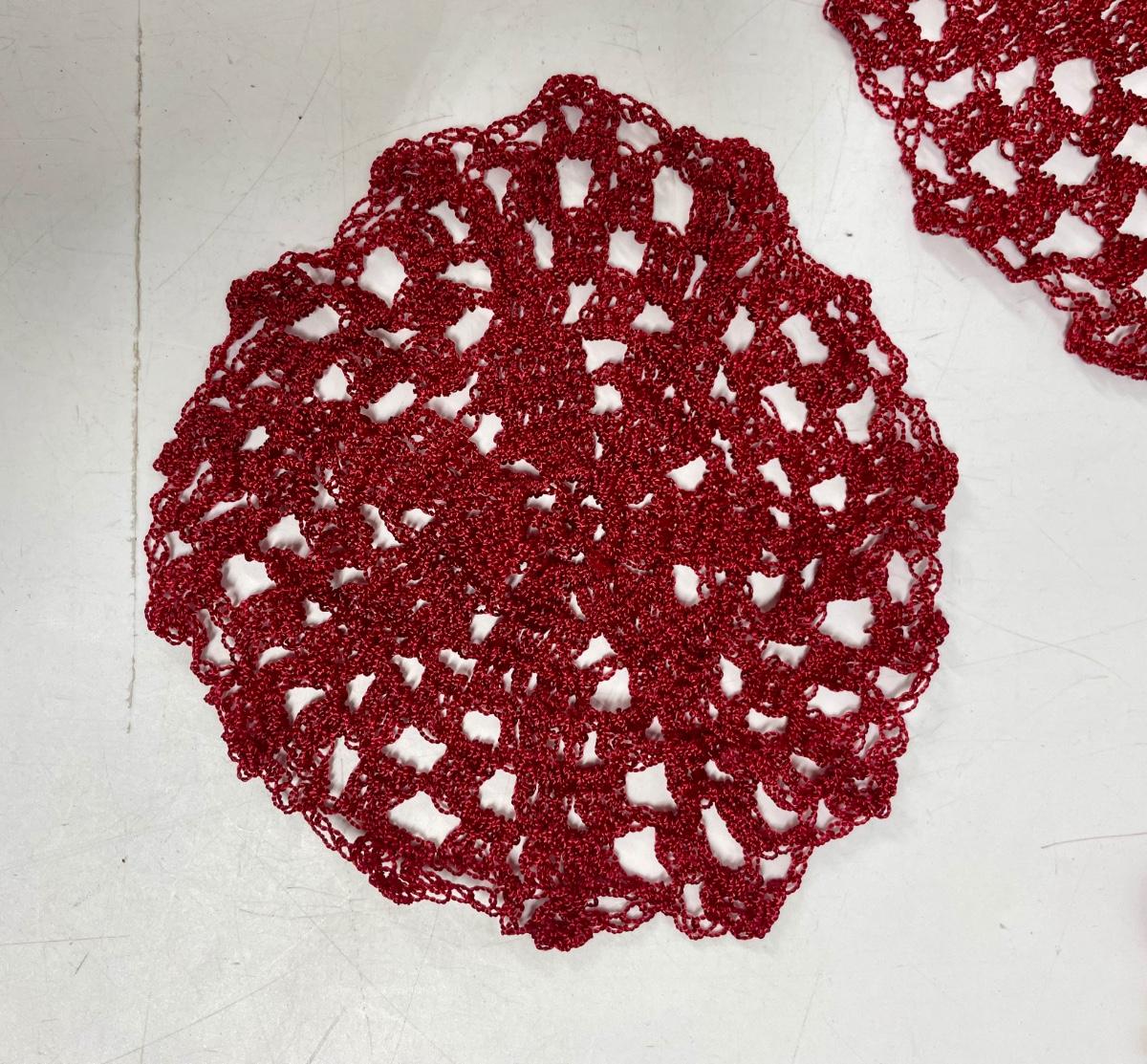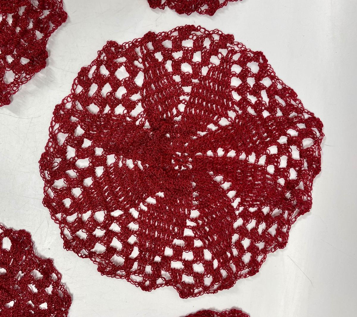 1 large 10” doily and 4 smaller 6” doilies. Far, deep red color.