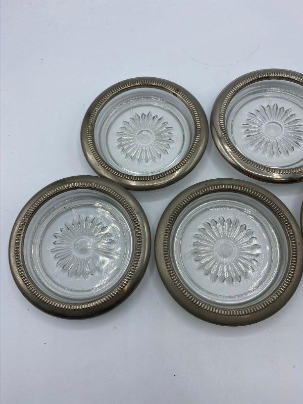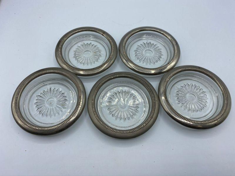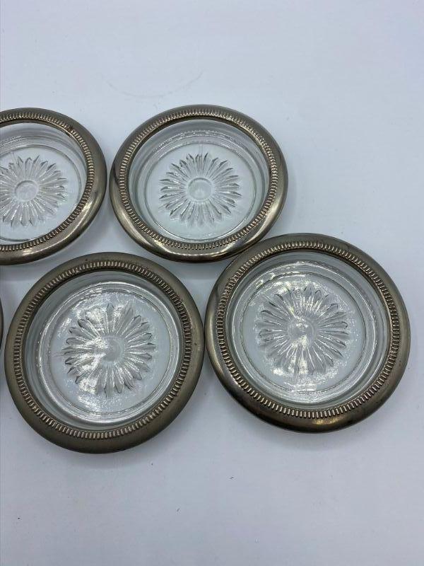Set of 5 silver rimmed coasters. Think they are silverplate as did not find any sterling marks on them. Good Condition, need a light polish/cleaning.
