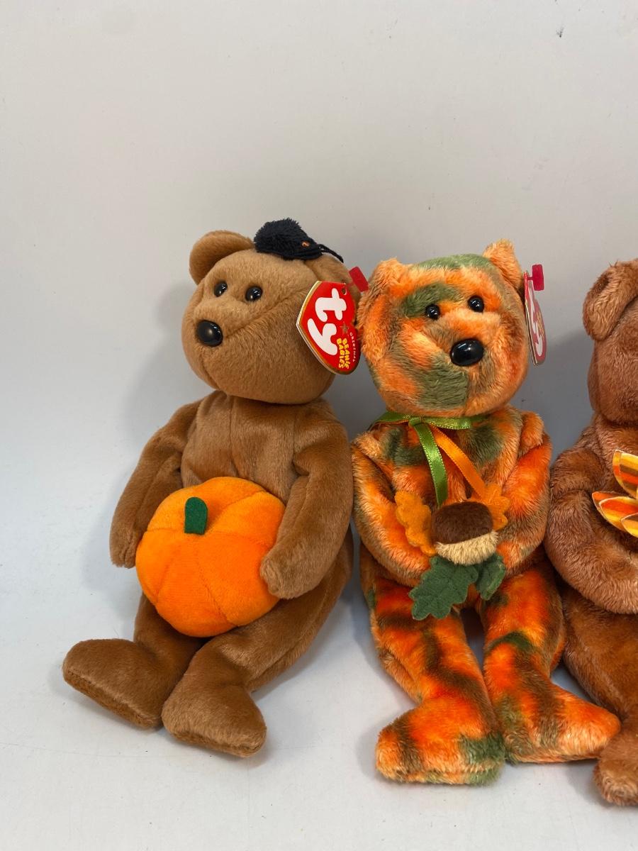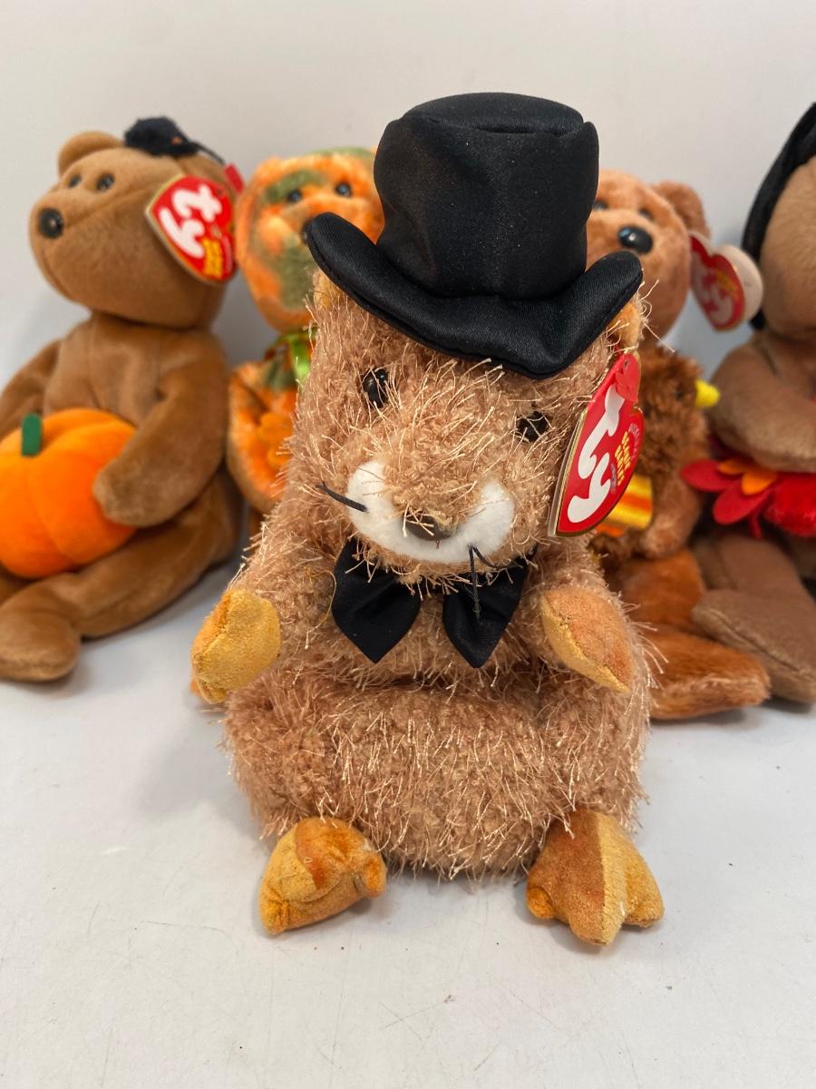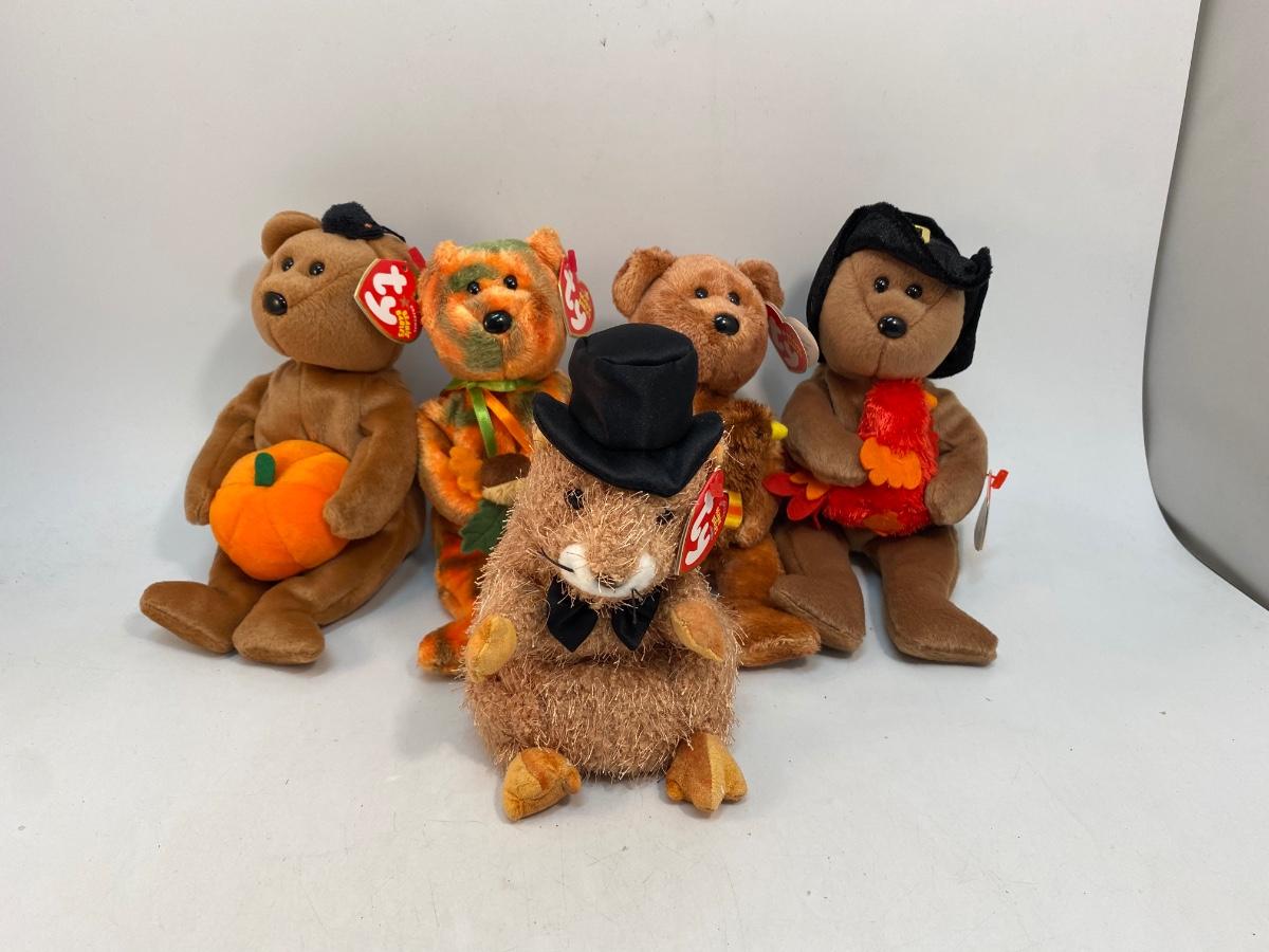 Set of 5 Thanksgiving Fall Autumn Themed TY Beanie Babies Plush Stuffed Animals. 4 bears and a groundhog. All have hang tags attached.