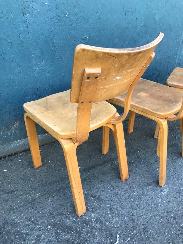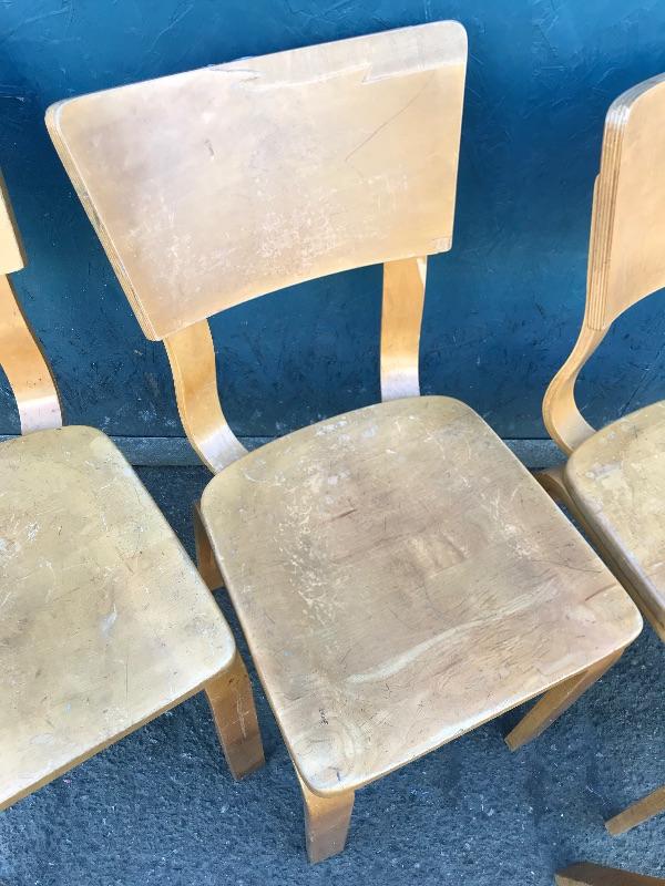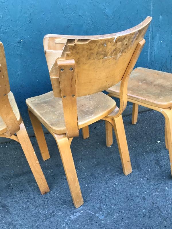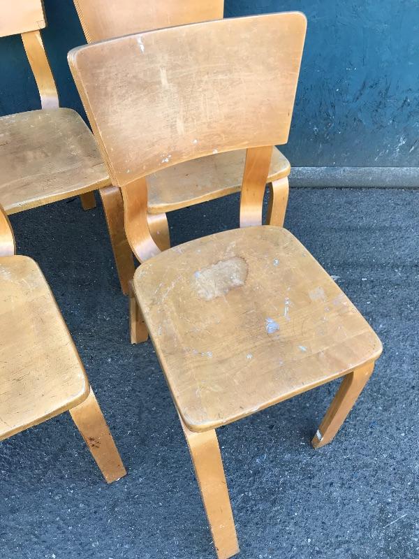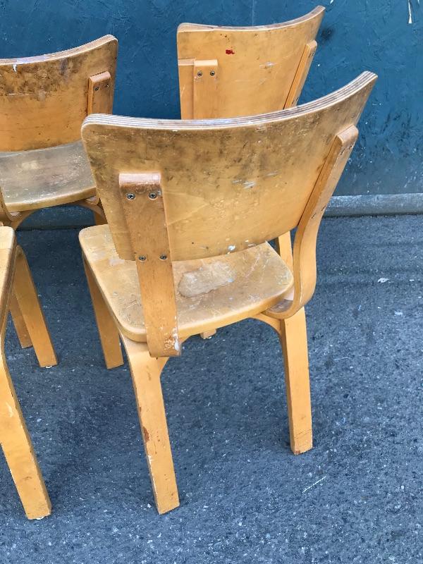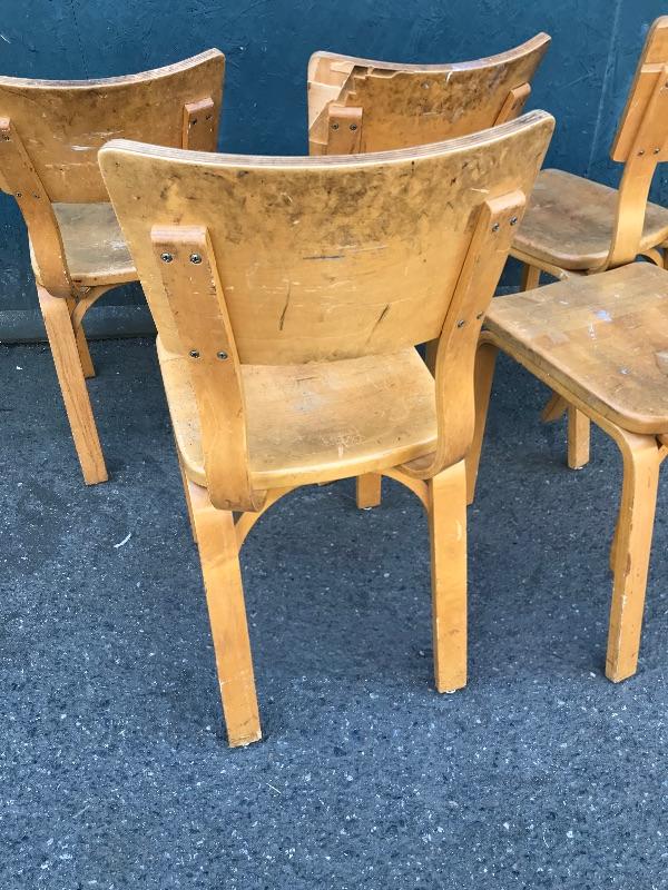 Three of the chairs have loose backs, one has a bent leg, and two are structurally perfect. They all have scratches and some paint splatters. Still very charming, modern looking chairs! Dimensions are 15”L x 18.5”W x 33”H, seat is 18.5”H.