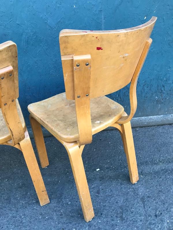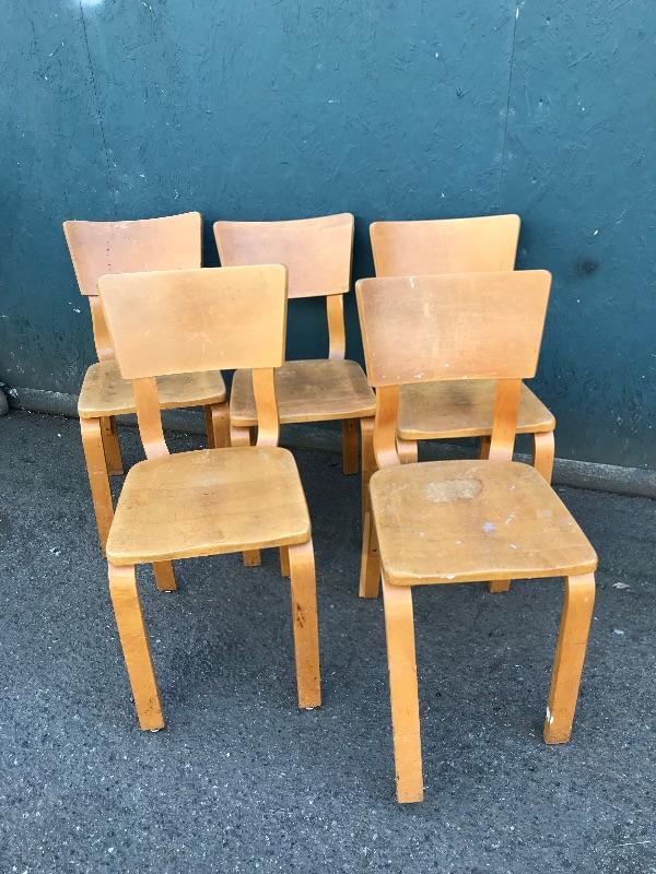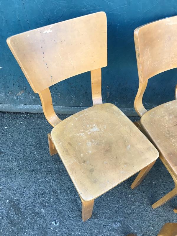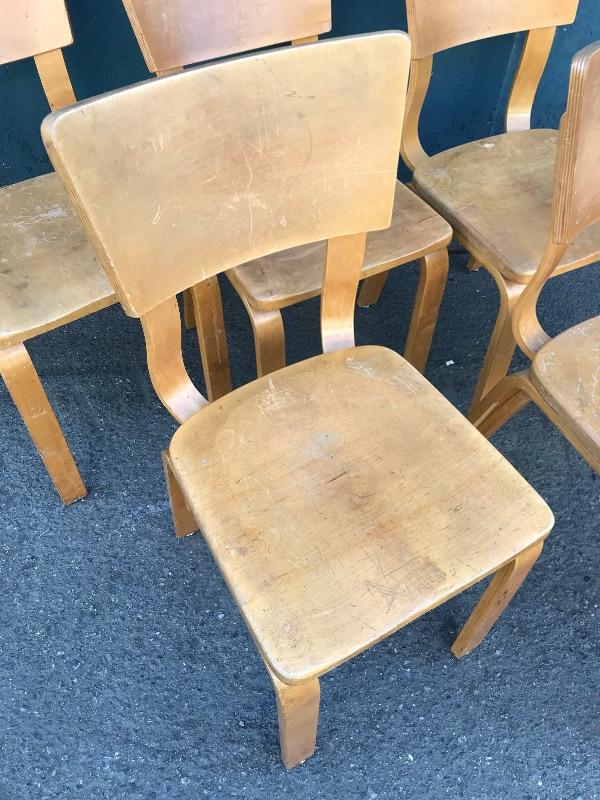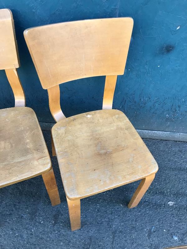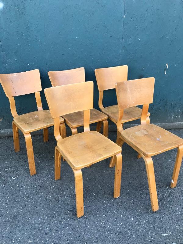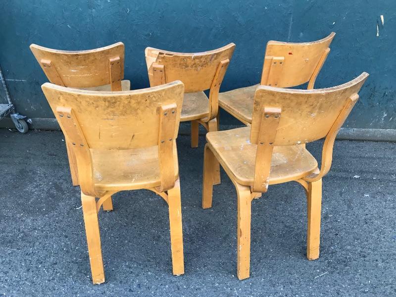 Three of the chairs have loose backs, one has a bent leg, and two are structurally perfect. They all have scratches and some paint splatters. Still very charming, modern looking chairs! Dimensions are 15”L x 18.5”W x 33”H, seat is 18.5”H.