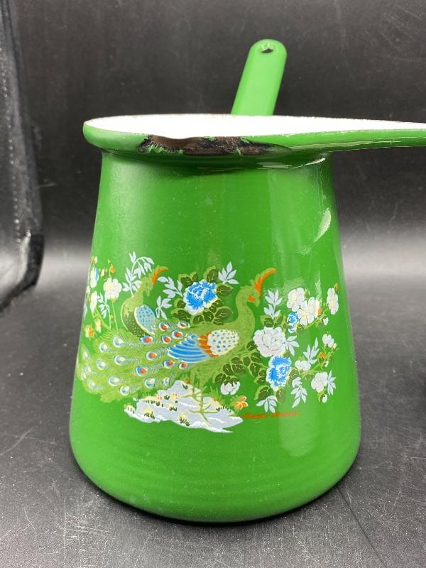 Set of 5 vintage enameled sauce pots. Single handled pots, various sizes and conditions. Display nicely, great for camping.