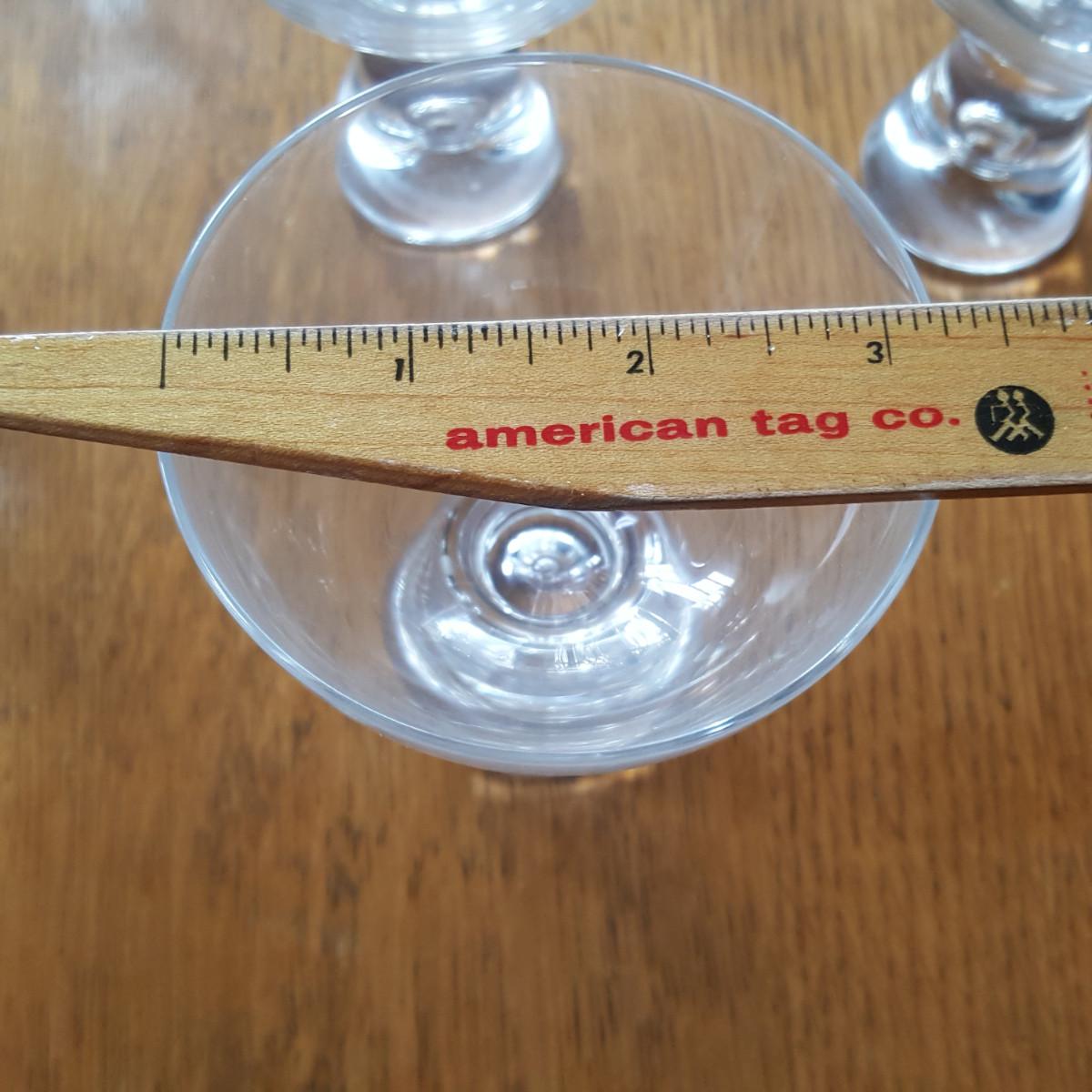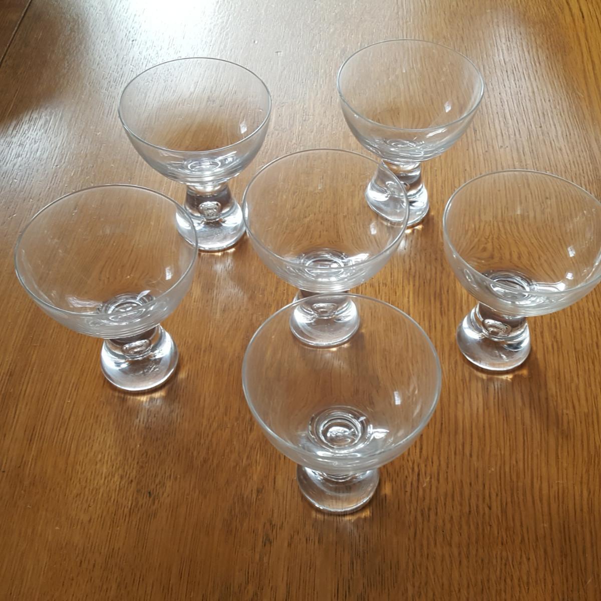 This auction lot is for a Set of 6 Iittala Glassworks Cocktail/Sherry Glasses. These glasses are from the famed Italian manufacturer of quality domestics. This very unique bubble-base design was introduced in 1954 and won the Grand Prix of Design in Milan that same year. The bubble in the stem not only reflexes light but the color of the beverage held within. These cocktail/sherry glasses stand about 4-inches tall and about 3-inches in diameter. NOTE: other sets of Iittala glasses are elsewhere in this auction.