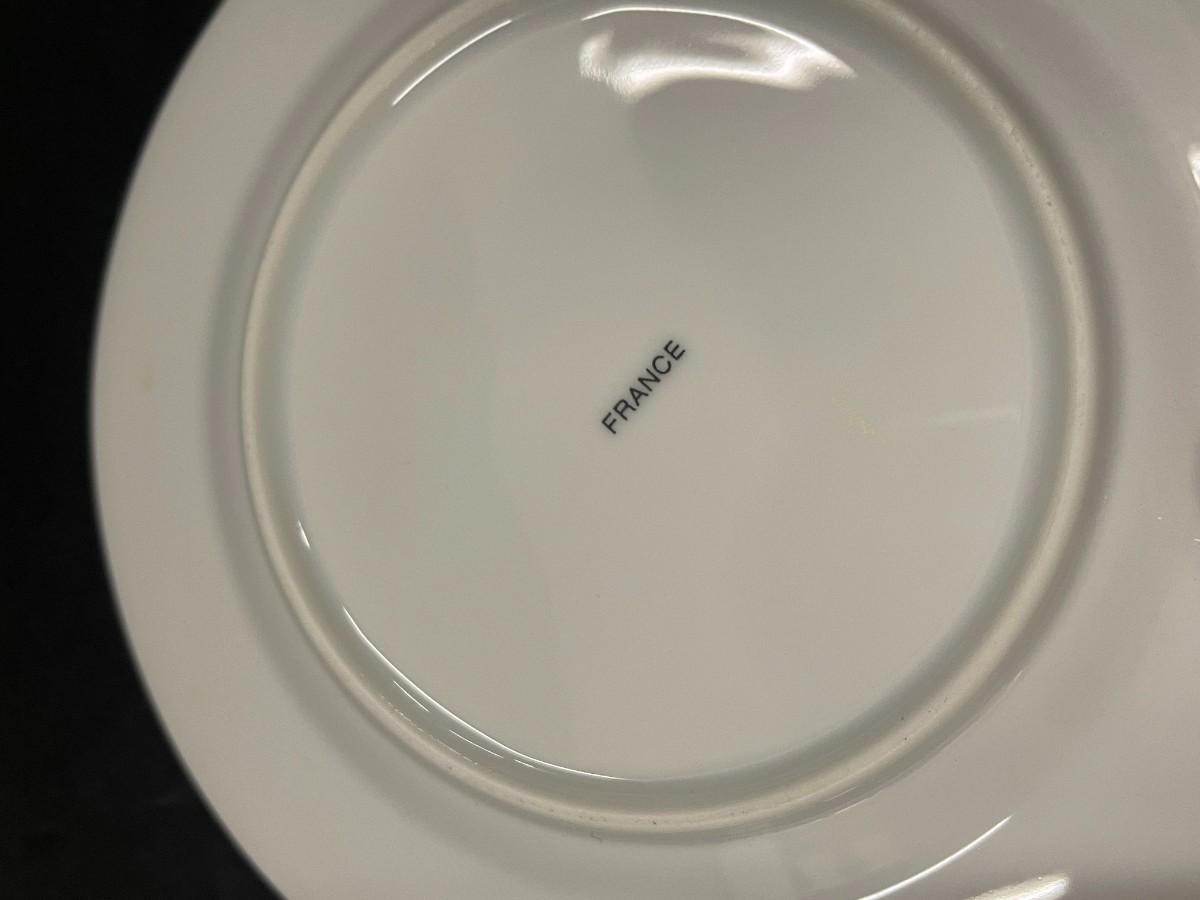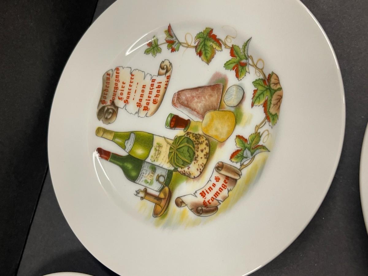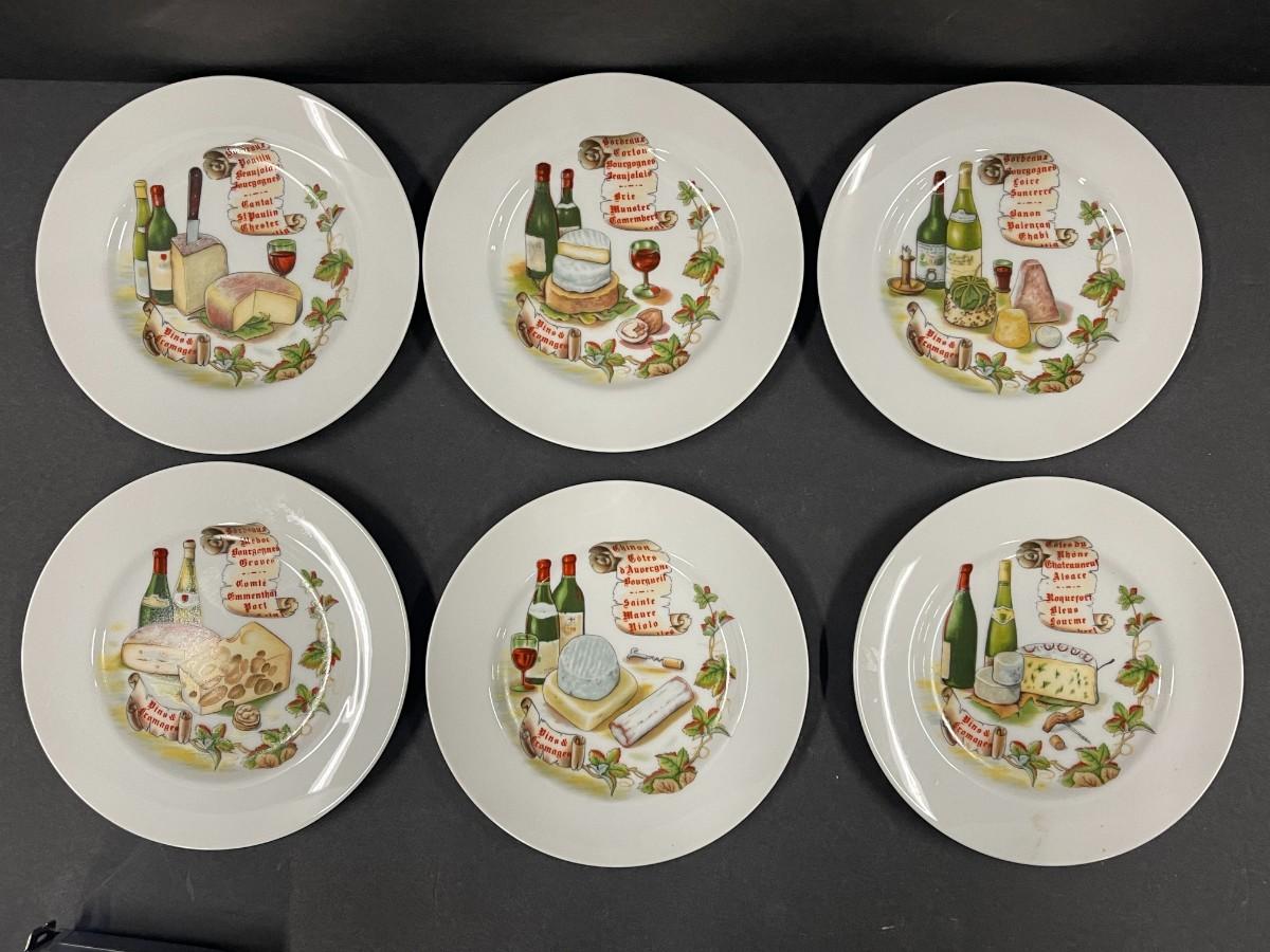 Set of 6 appetizer/cheese plates. Each has a different cheese and wine image. All in excellent condition. Made in France. Approx 6 1/2"