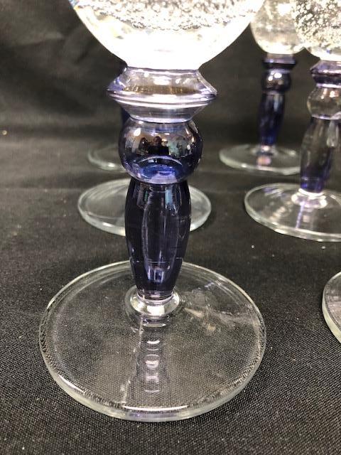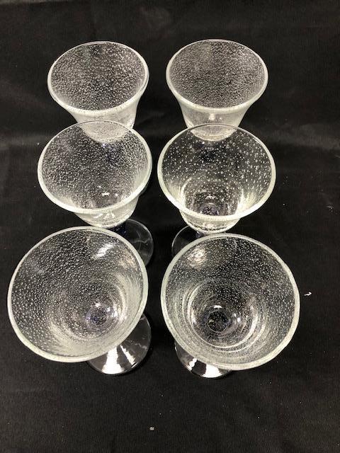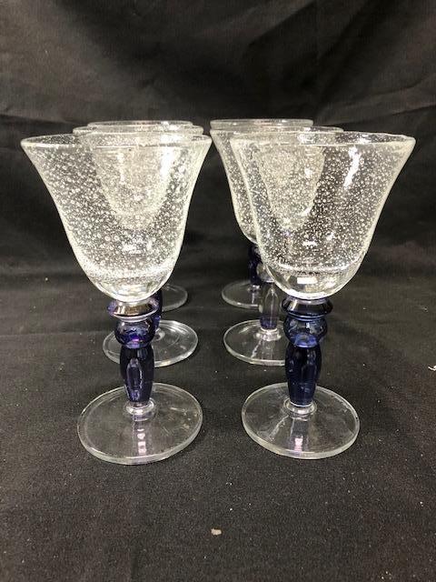 6 bubble glass goblets. Blue stems, one of which is very faded. Heavy thick glass. Good condition.