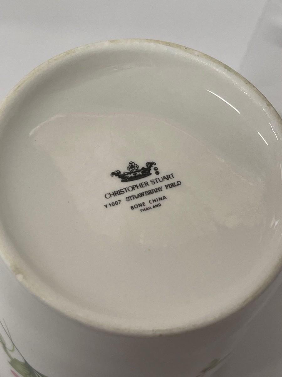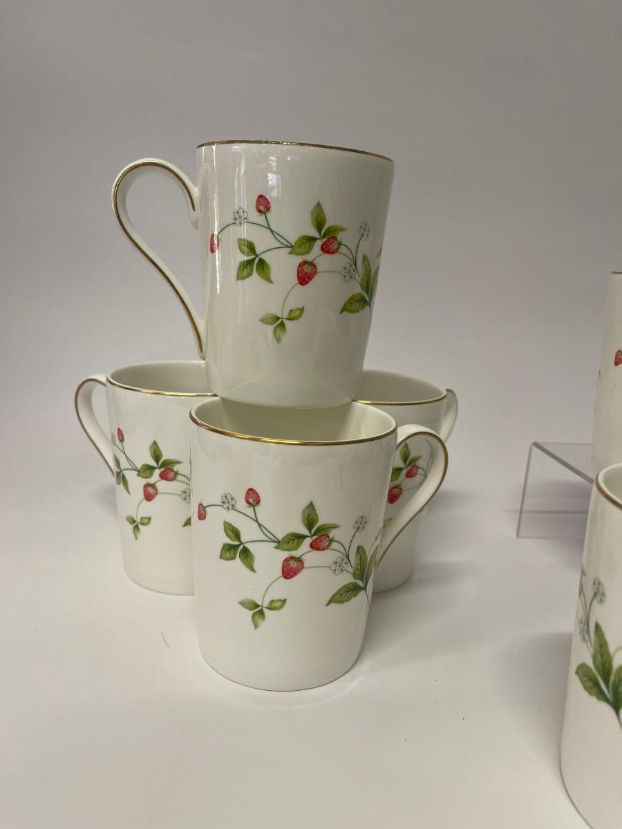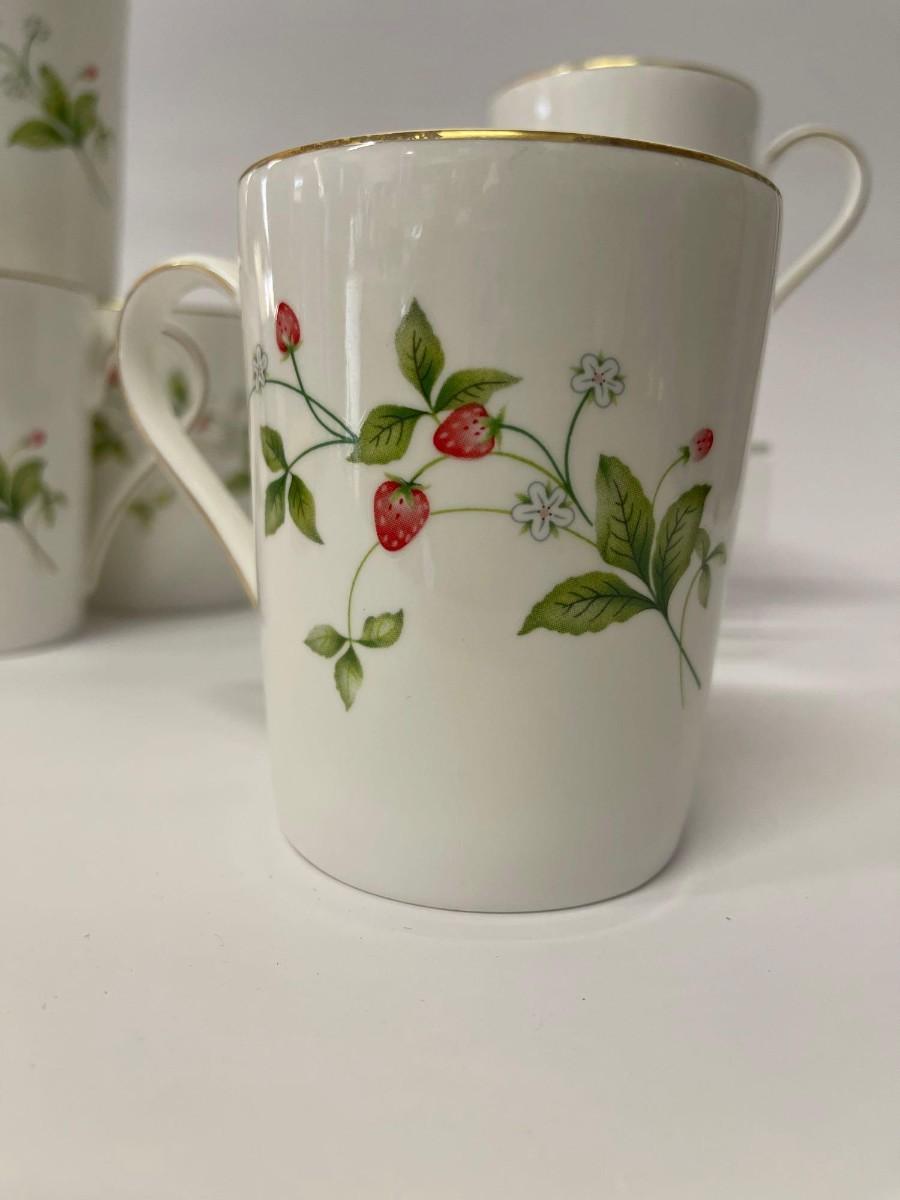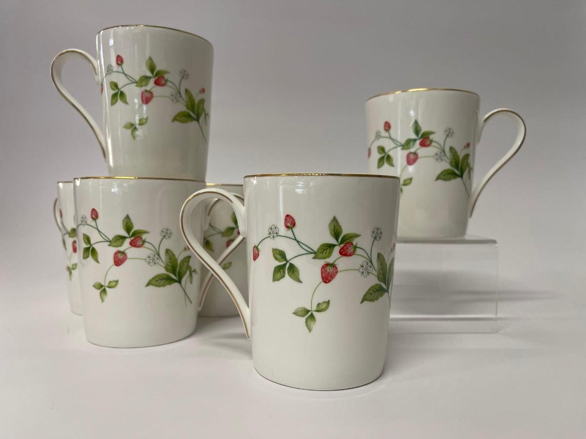 Set of 6 Christopher Stuart Strawberry Fields Bone China Coffee Mugs. Approx 4” high with 3” opening. Excellent condition, one of the mugs has so wear to the rim.
