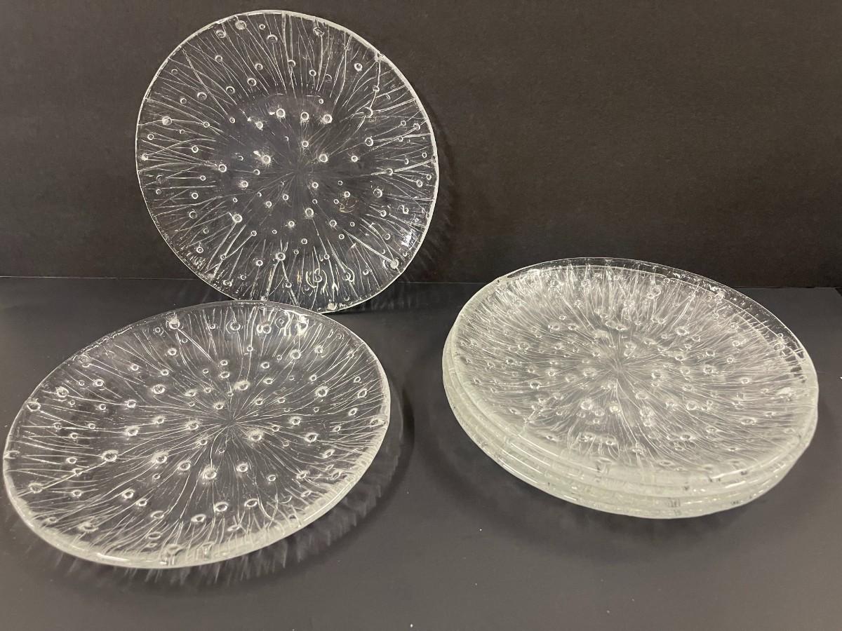 Set of 6 clear glass salad plates with pebbled, textured pattern throughout. Shows wear from being stacked. 8 1/2" diameter.