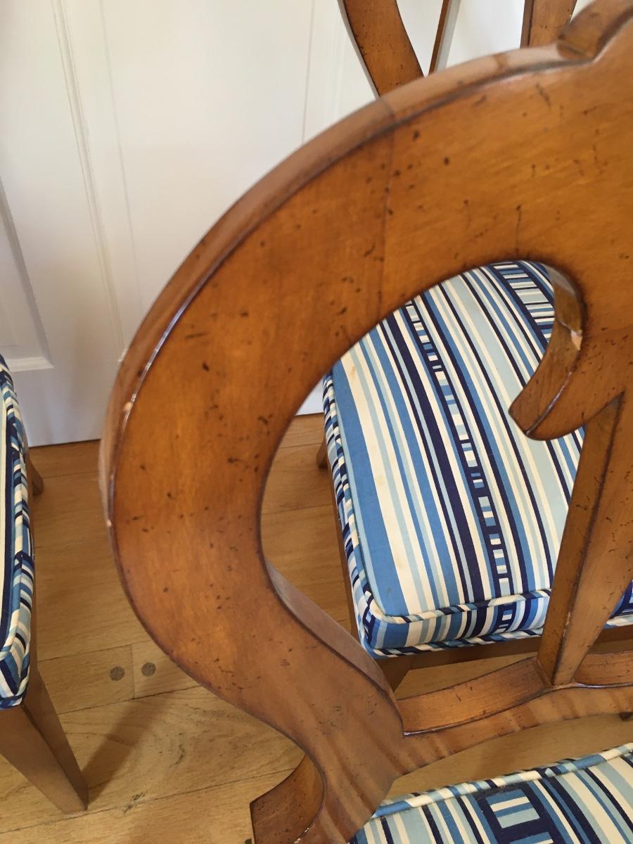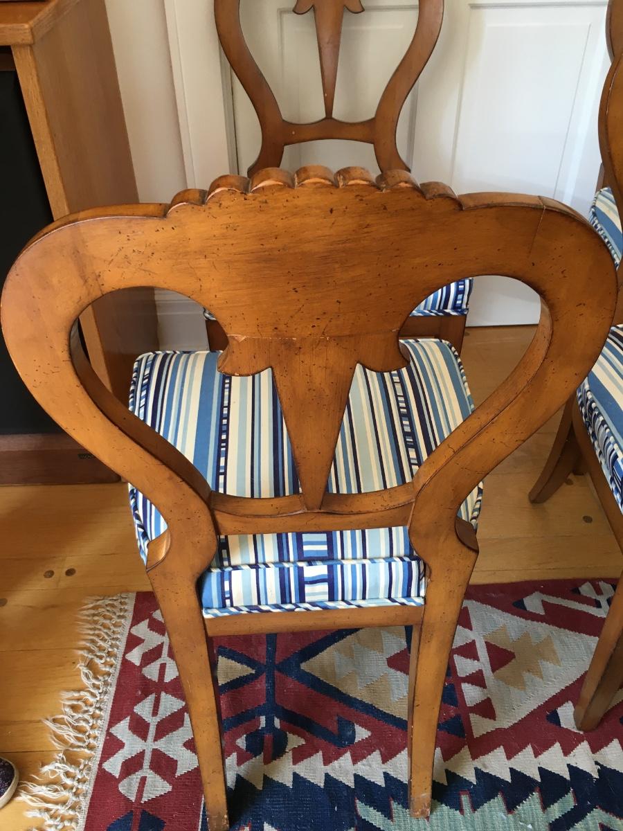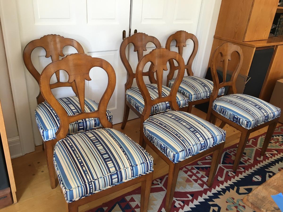 Set of 6 Biedermeier decorative back solid wood dining room chairs with upholstered seat. Some slight wear on chairs as shown in photos and some small stains on seats, but no rips or tears. Very sturdy and heavy.