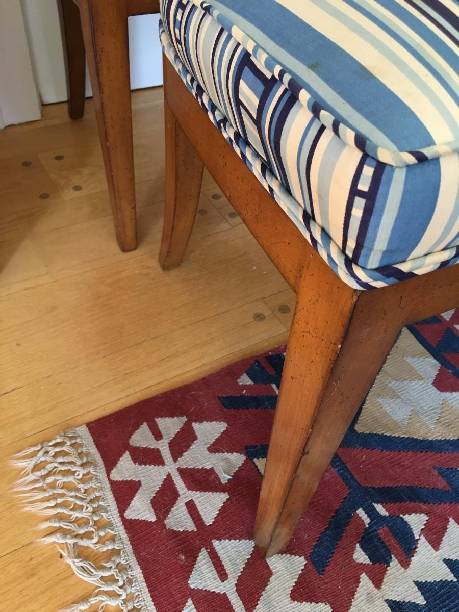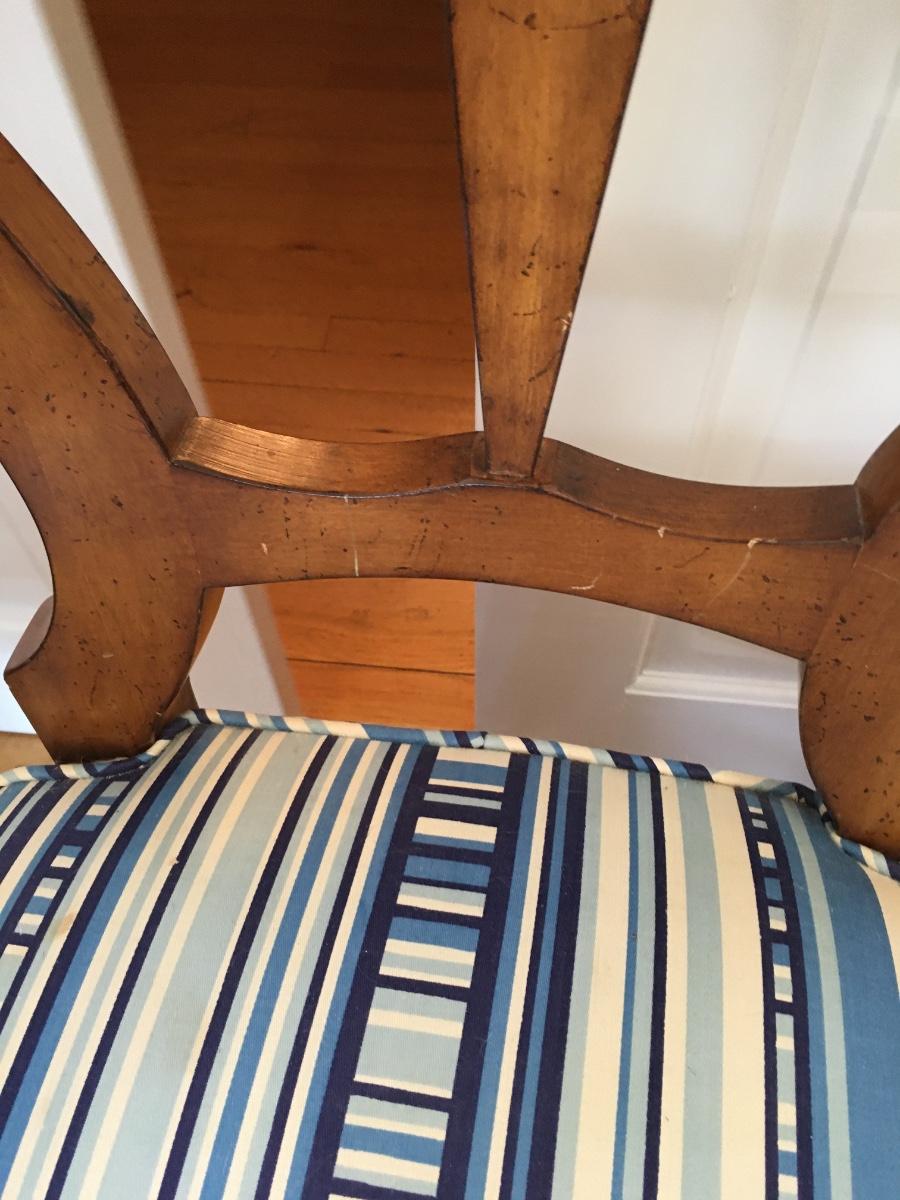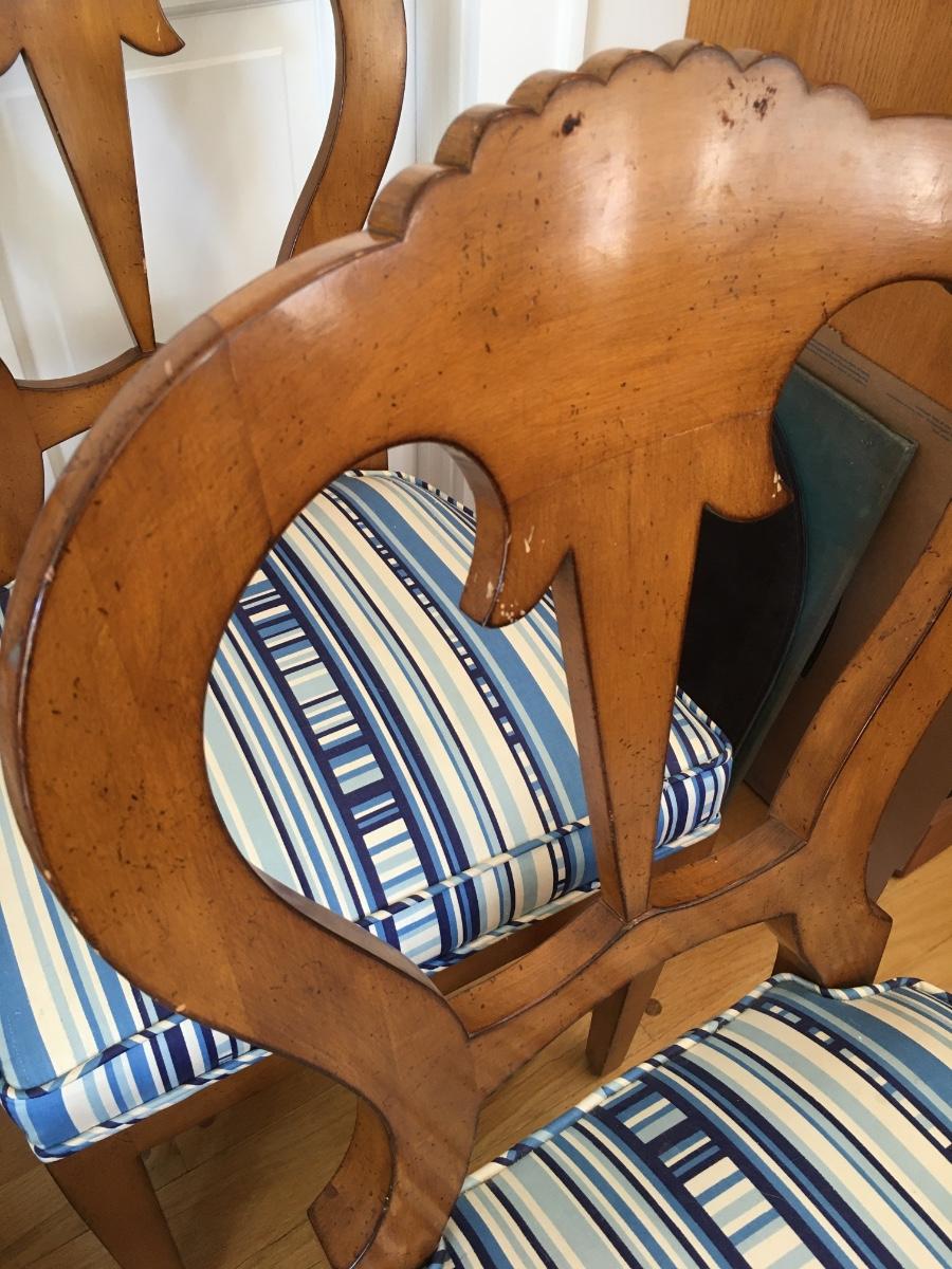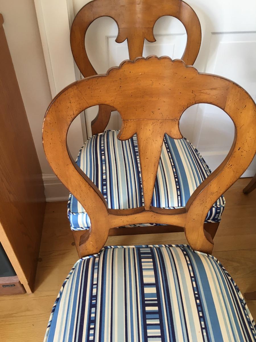 Set of 6 Biedermeier decorative back solid wood dining room chairs with upholstered seat. Some slight wear on chairs as shown in photos and some small stains on seats, but no rips or tears. Very sturdy and heavy.