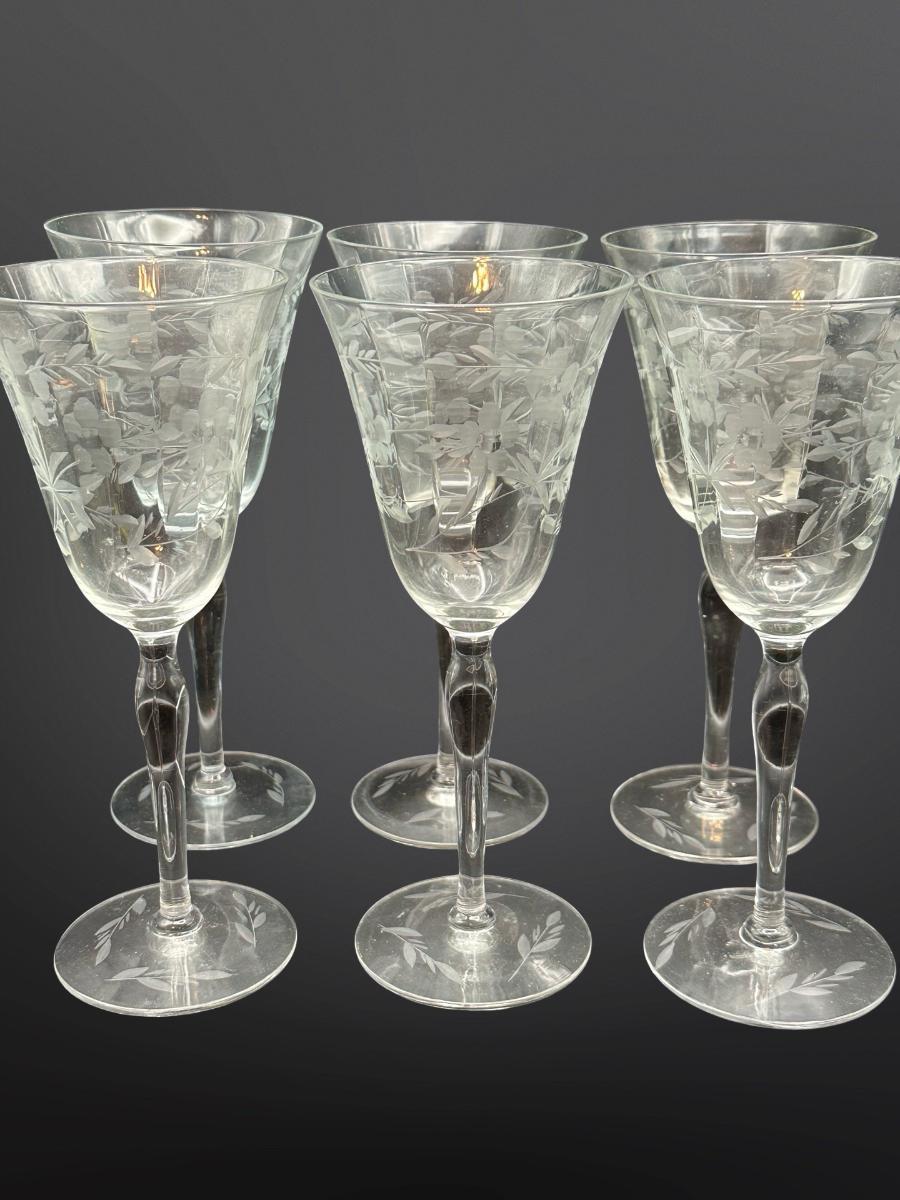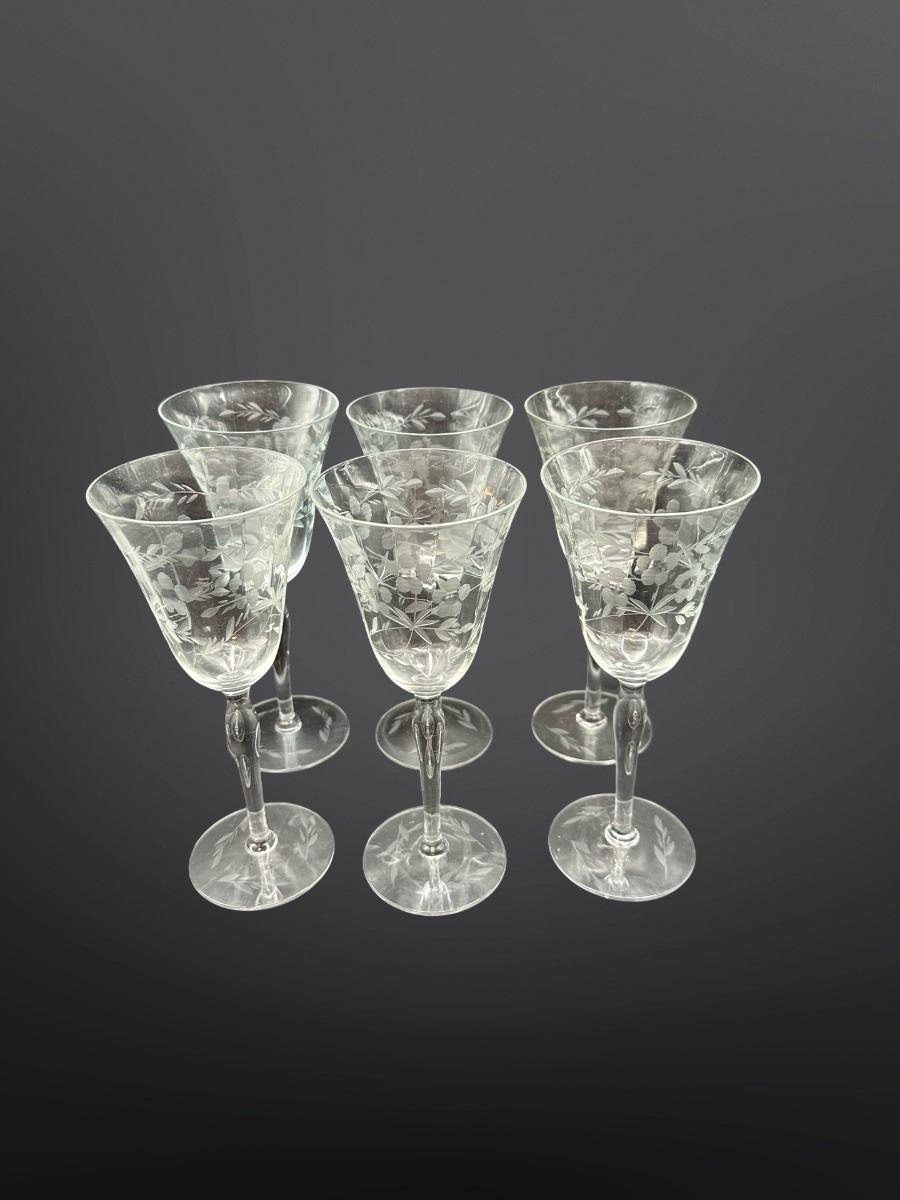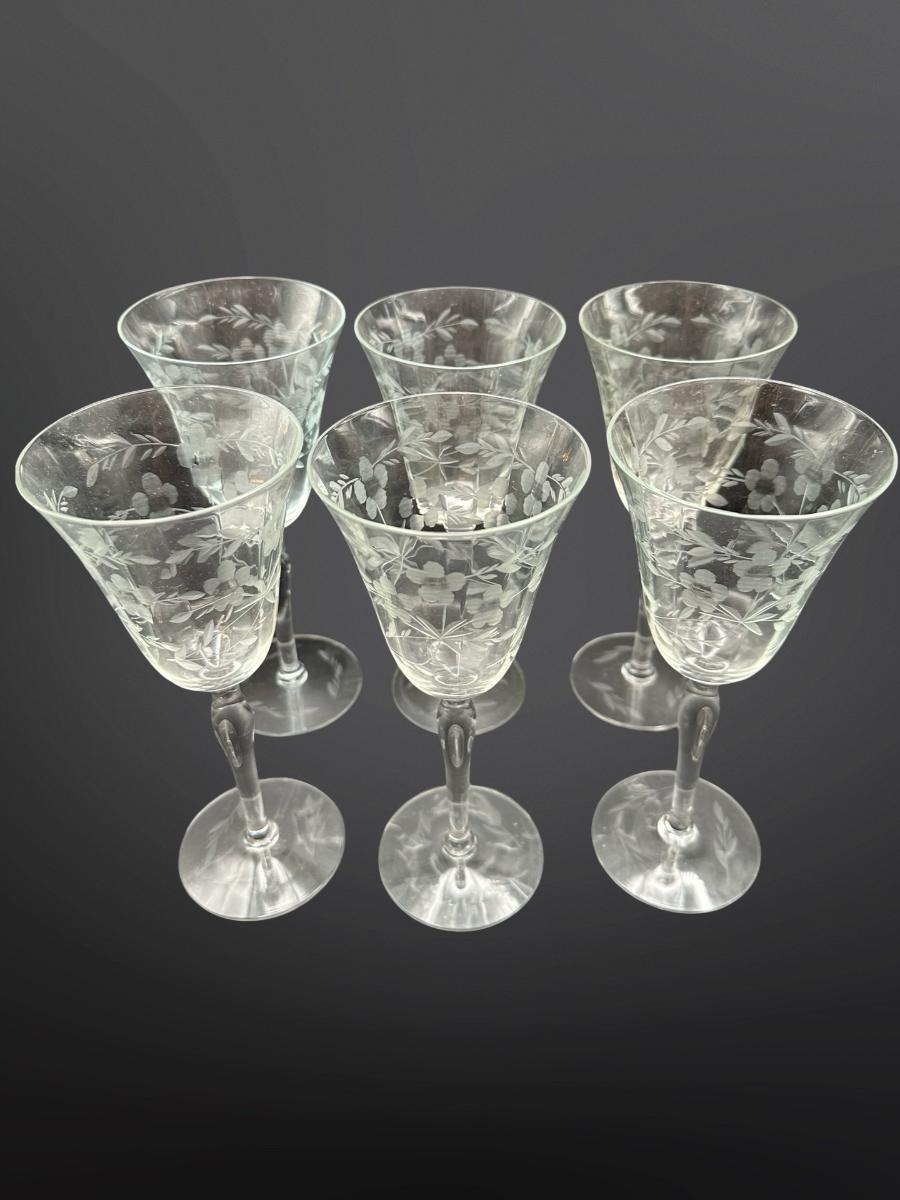 Set of 6 Etched Crystal Wine or Cordial Glasses with Floral and Leaf Design
