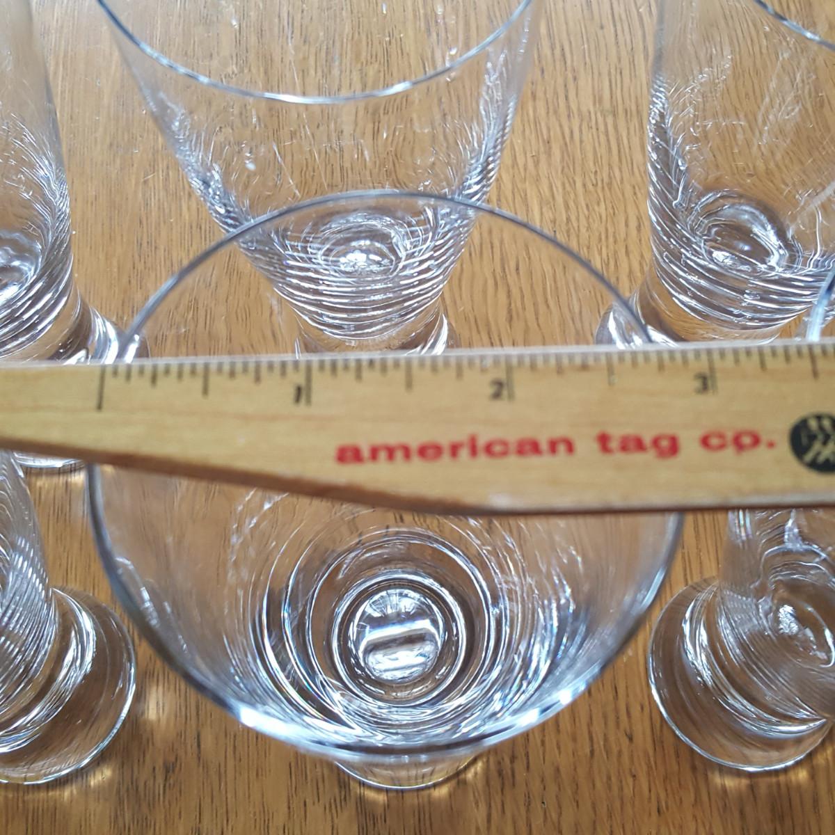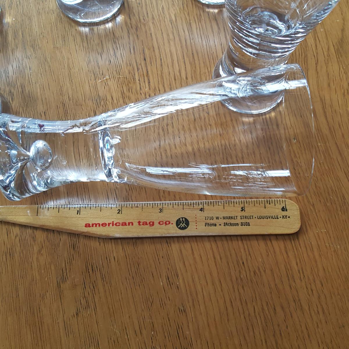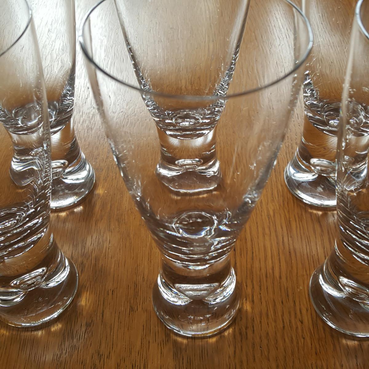 This auction lot is for a Set of 6 Iittala Glassworks Beer Glasses. These glasses are from the famed Italian manufacturer of quality domestics. This very unique bubble-base design was introduced in 1954 and won the Grand Prix of Design in Milan that same year. The bubble in the stem not only reflex light but the color of the beverage held within. These beer glasses stand about 6.5-inches tall and about 3-inches in diameter. NOTE: other sets of Iittala glasses are elsewhere in this auction.