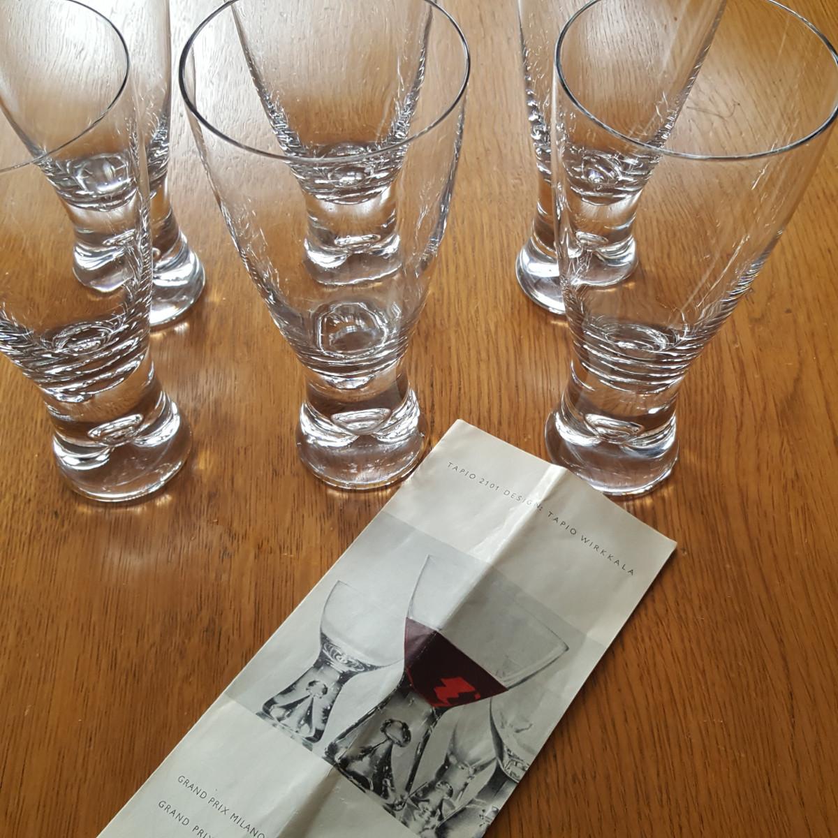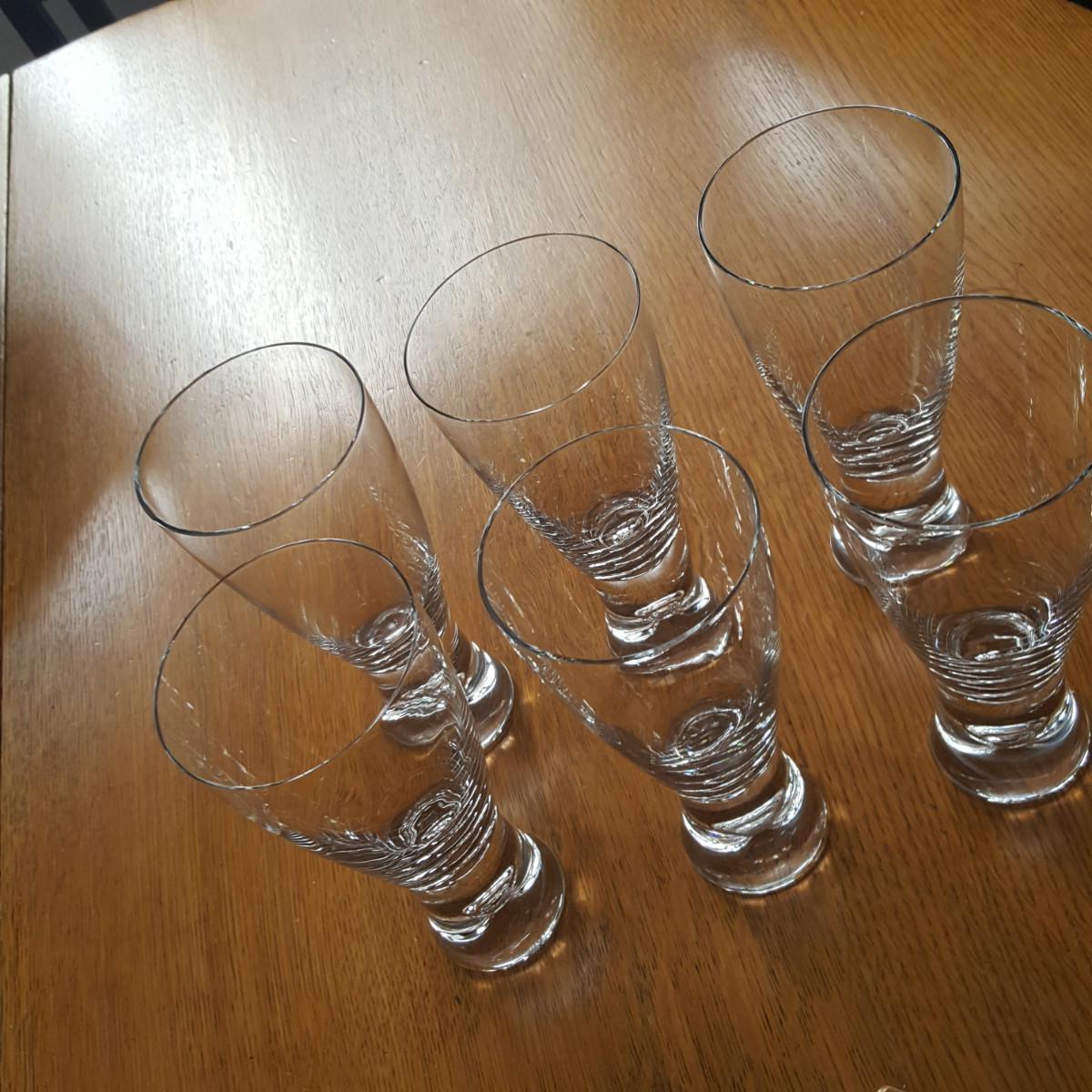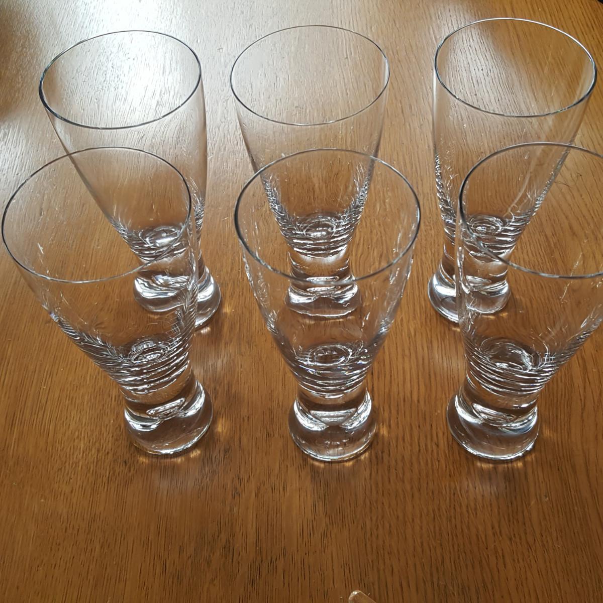 This auction lot is for a Set of 6 Iittala Glassworks Beer Glasses. These glasses are from the famed Italian manufacturer of quality domestics. This very unique bubble-base design was introduced in 1954 and won the Grand Prix of Design in Milan that same year. The bubble in the stem not only reflex light but the color of the beverage held within. These beer glasses stand about 6.5-inches tall and about 3-inches in diameter. NOTE: other sets of Iittala glasses are elsewhere in this auction.
