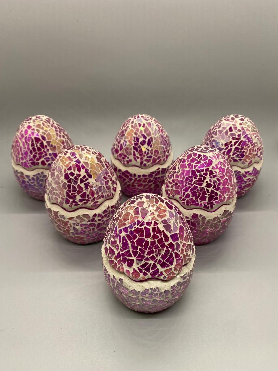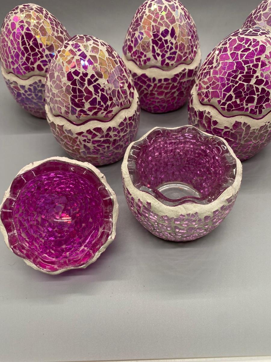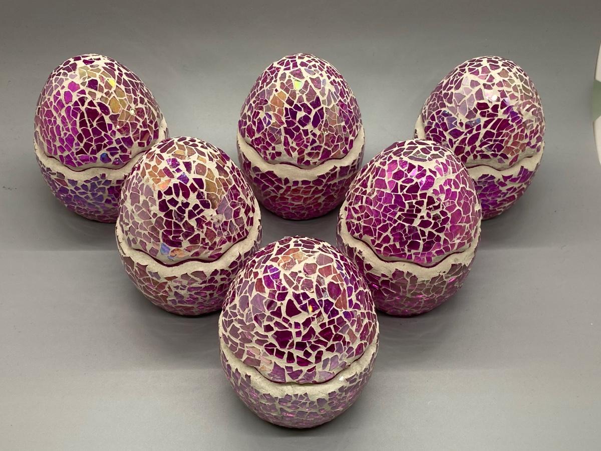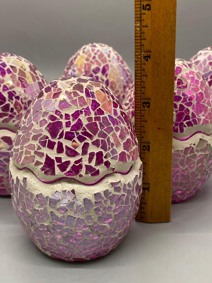 6 pink iridescent mosaic glass Easter eggs. Two-piece eggs, great as trinket dishes or candle holders. Would fit tealight candles nicely, maybe votives. Good condition.
