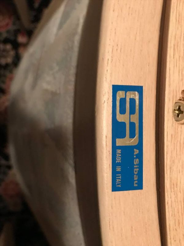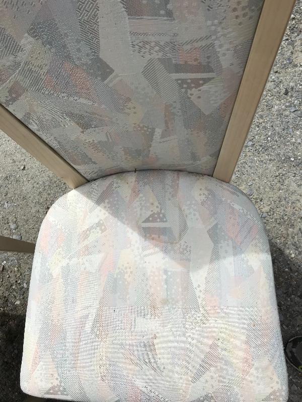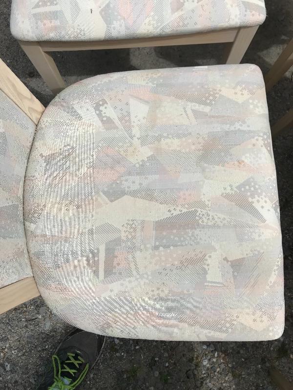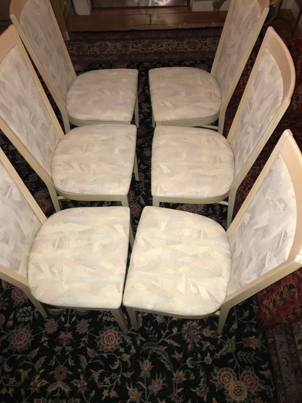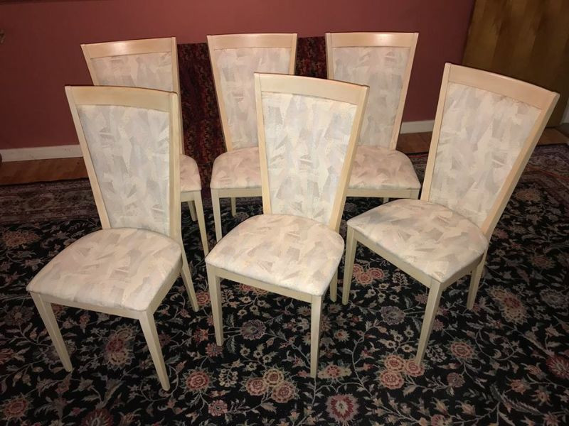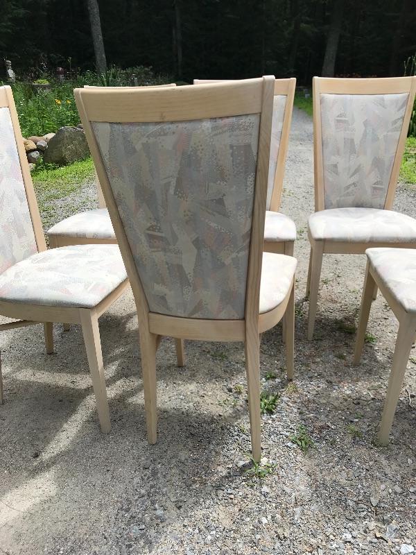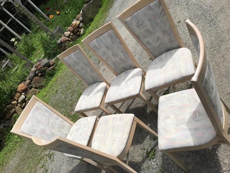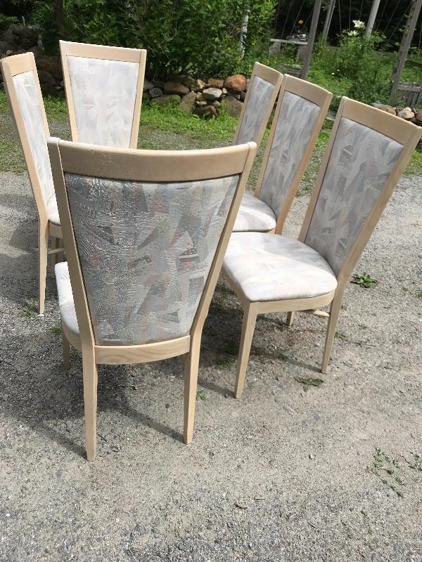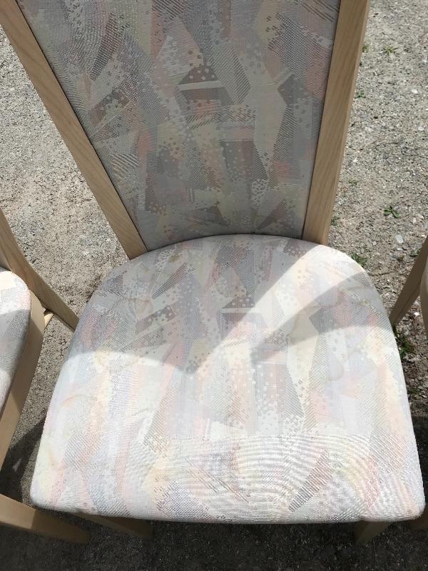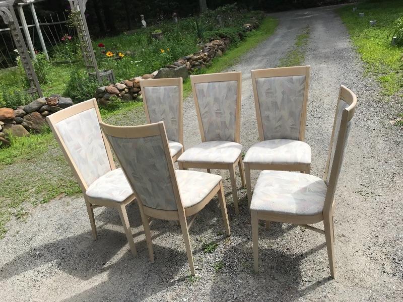 This is a set of 6 dining chairs. They are made of high quality material and made by A. Sibau. They are used. They have some staying on a couple of chairs but otherwise are in very good condition. The fabric is in great shape. The chairs are very sturdy and very comfortable. The wood is like a blonde color.