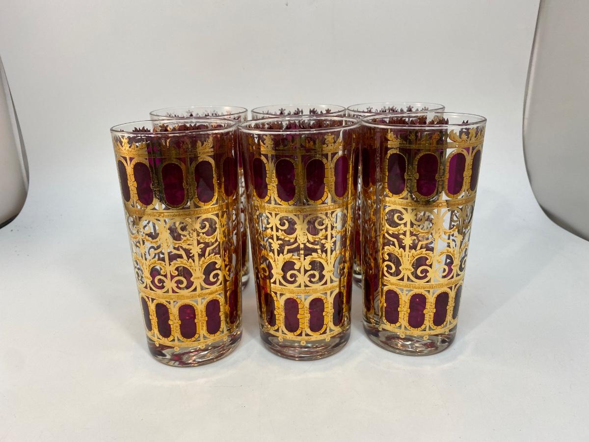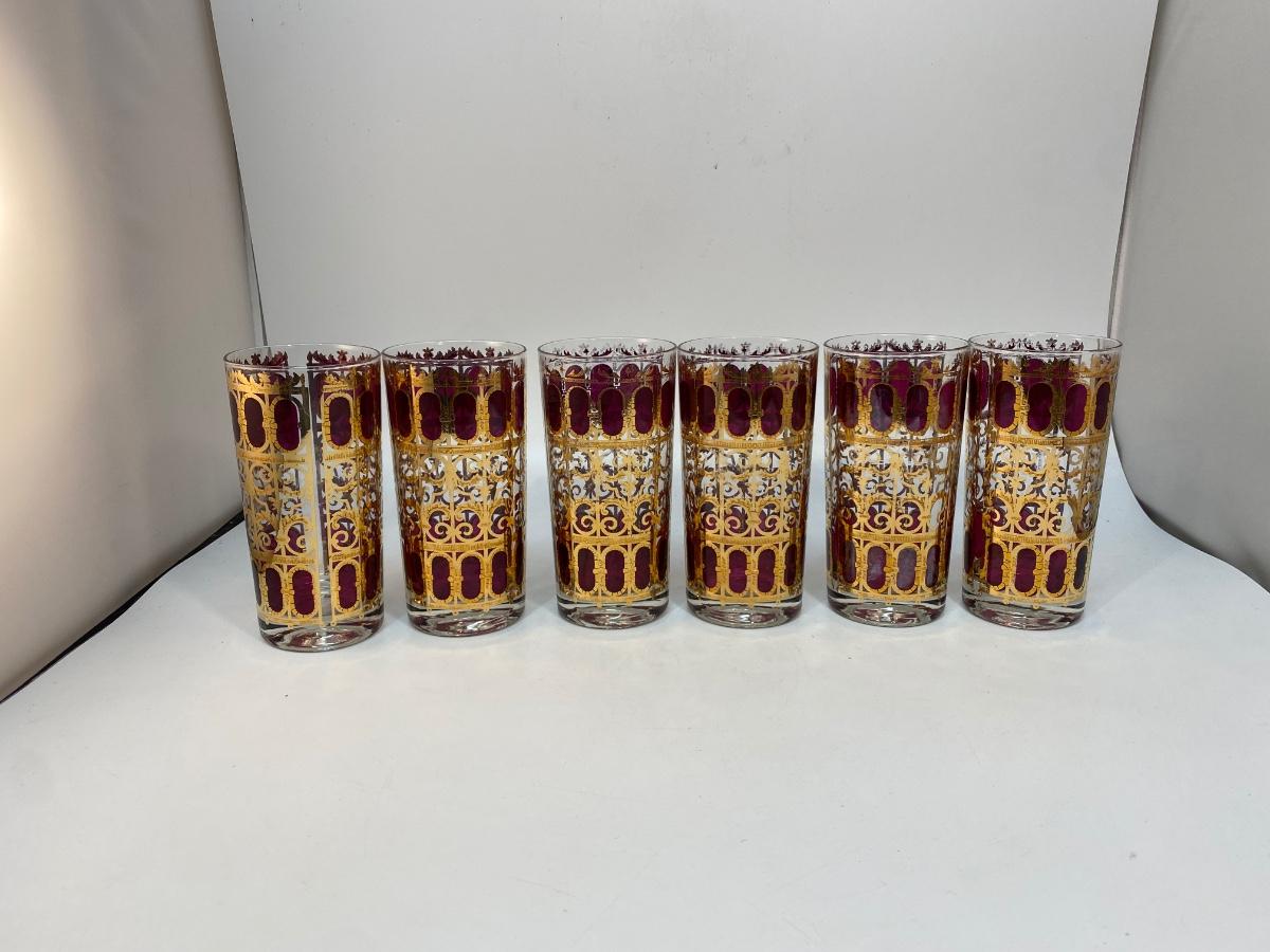 Set of 6 Mid Century MCM Culver Cranberry Scroll Red & Gold Highball Drink Glasses. Wear to the pattern, more on some than others. About 5.5" tall.