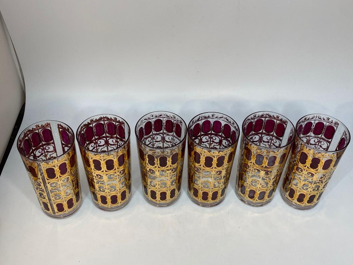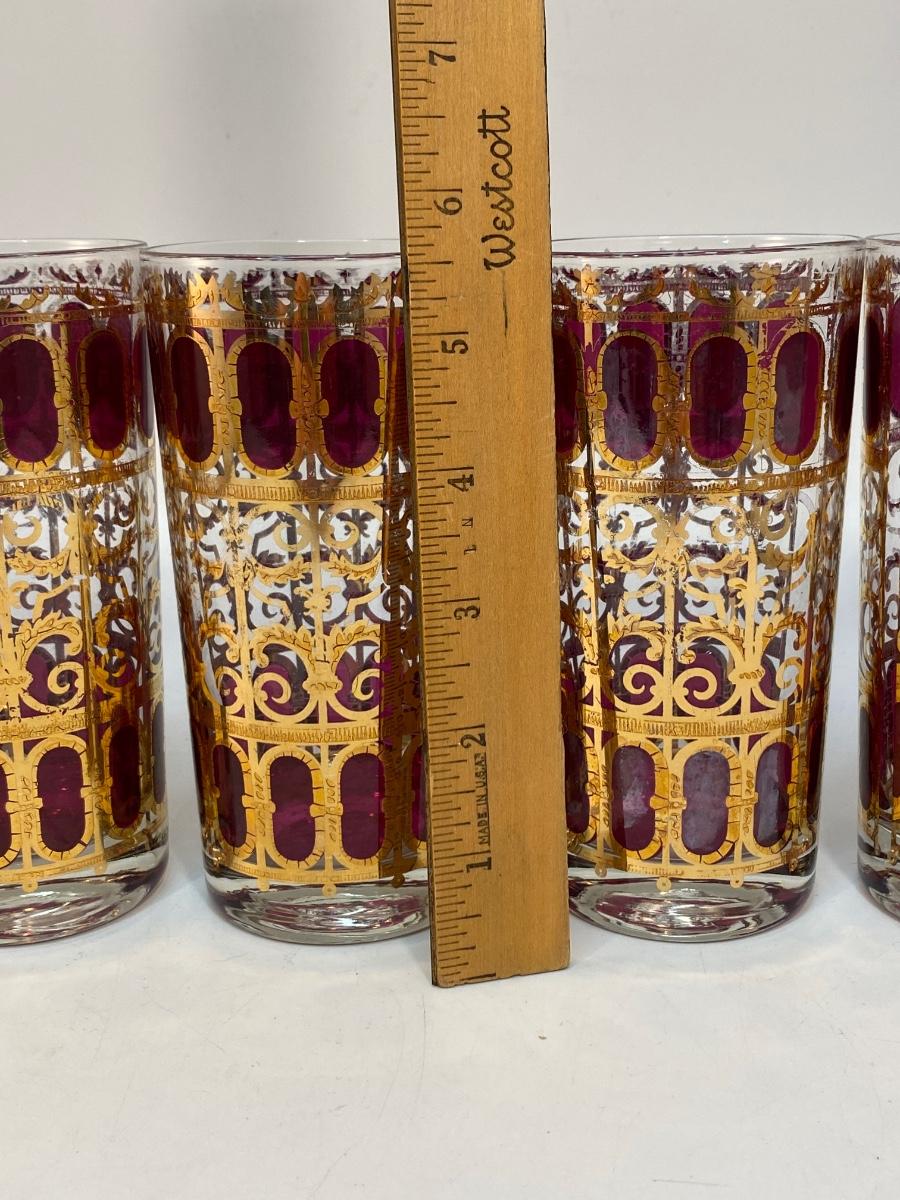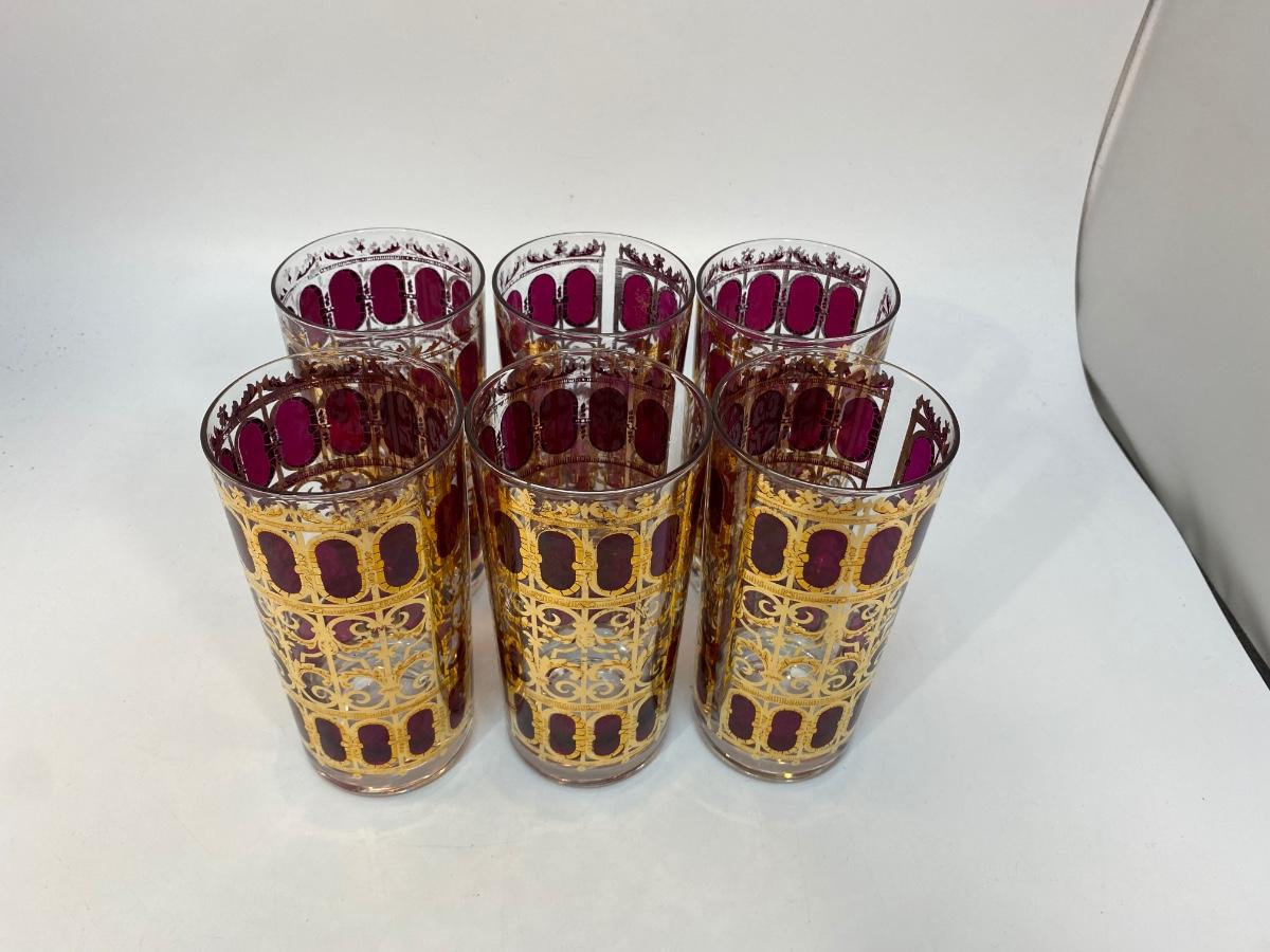 Set of 6 Mid Century MCM Culver Cranberry Scroll Red & Gold Highball Drink Glasses