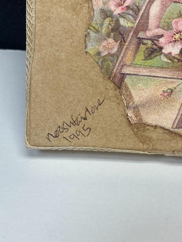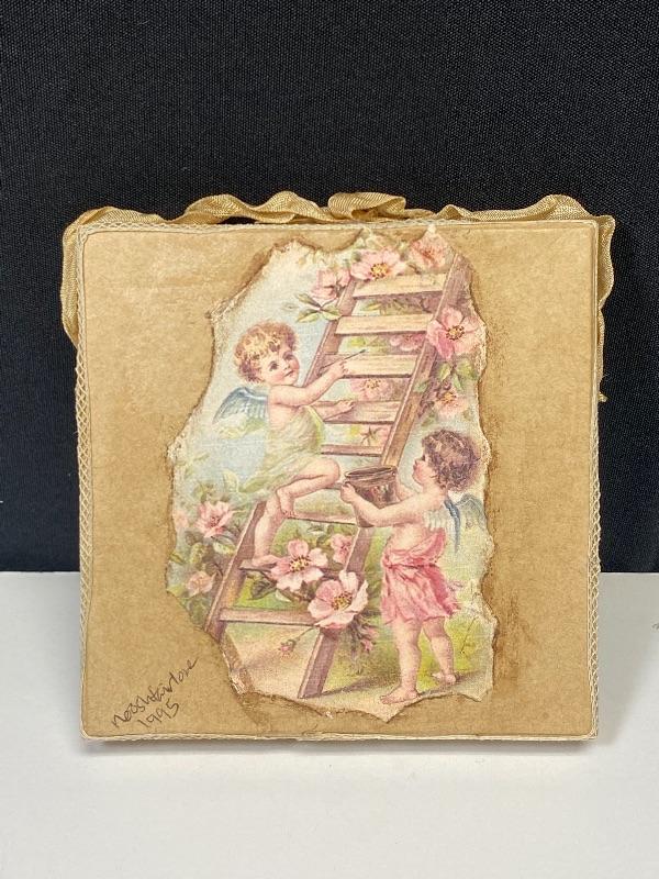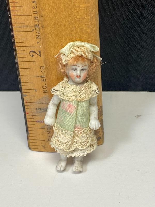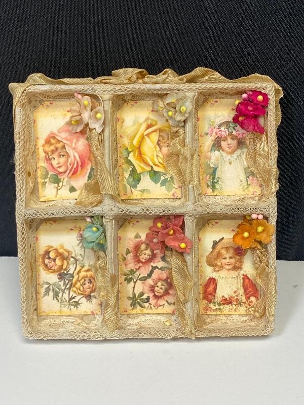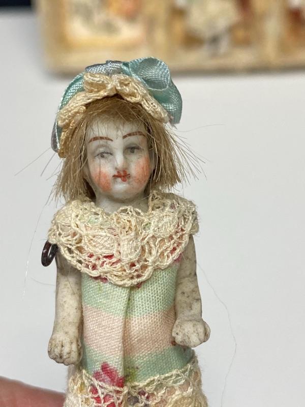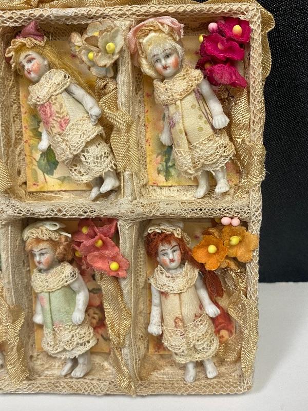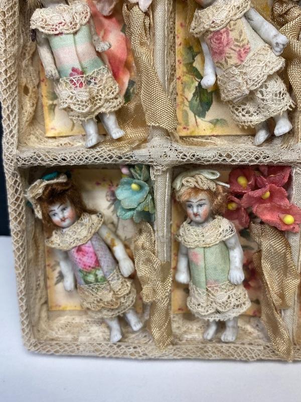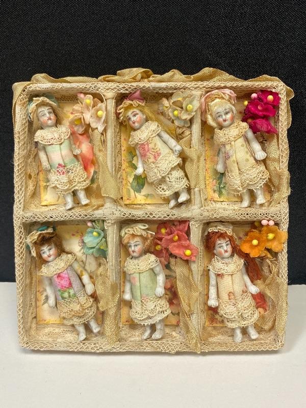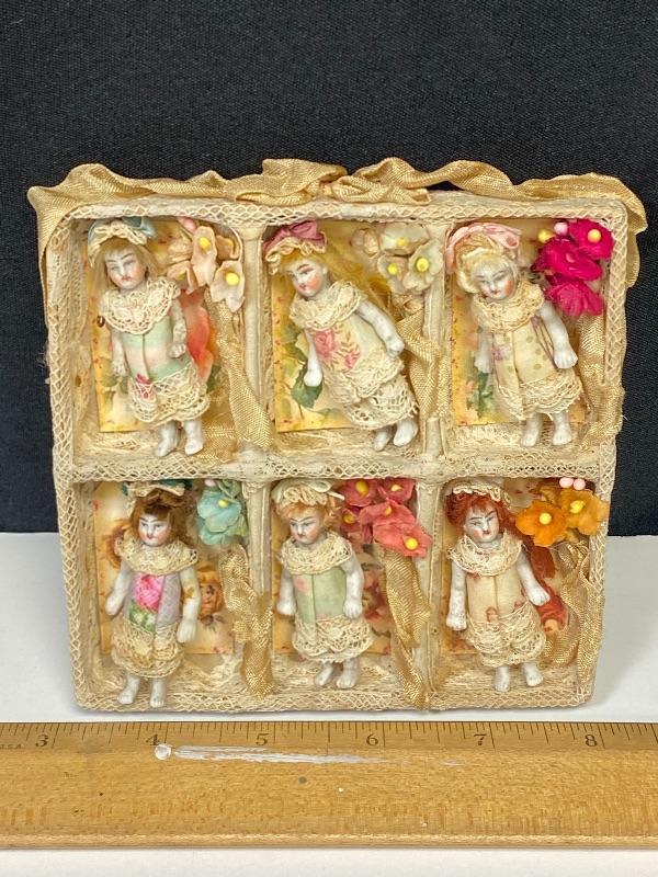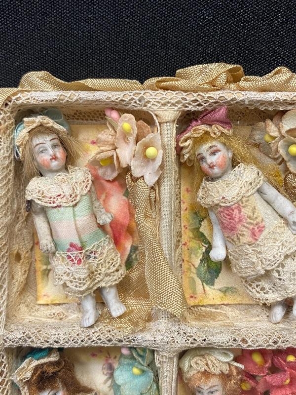 Set of 6 small porcelain jointed dollhouse dolls. 2" size. All have been dressed, have hair. They are in a lace and Victorian decopage display box. Box is about 5" square. May be dusty from display.