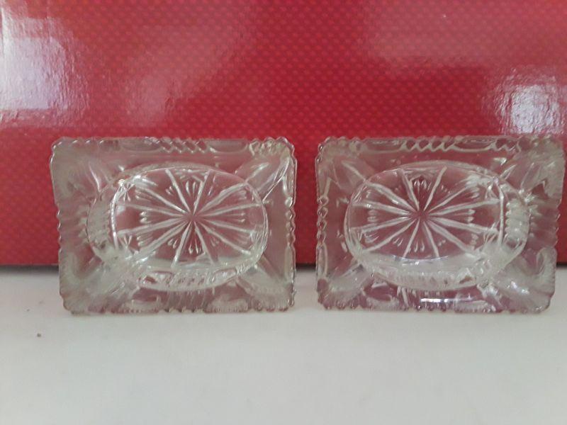 Set of 2 master salts and 3 individual salts. No spoons. Clear cut glass.