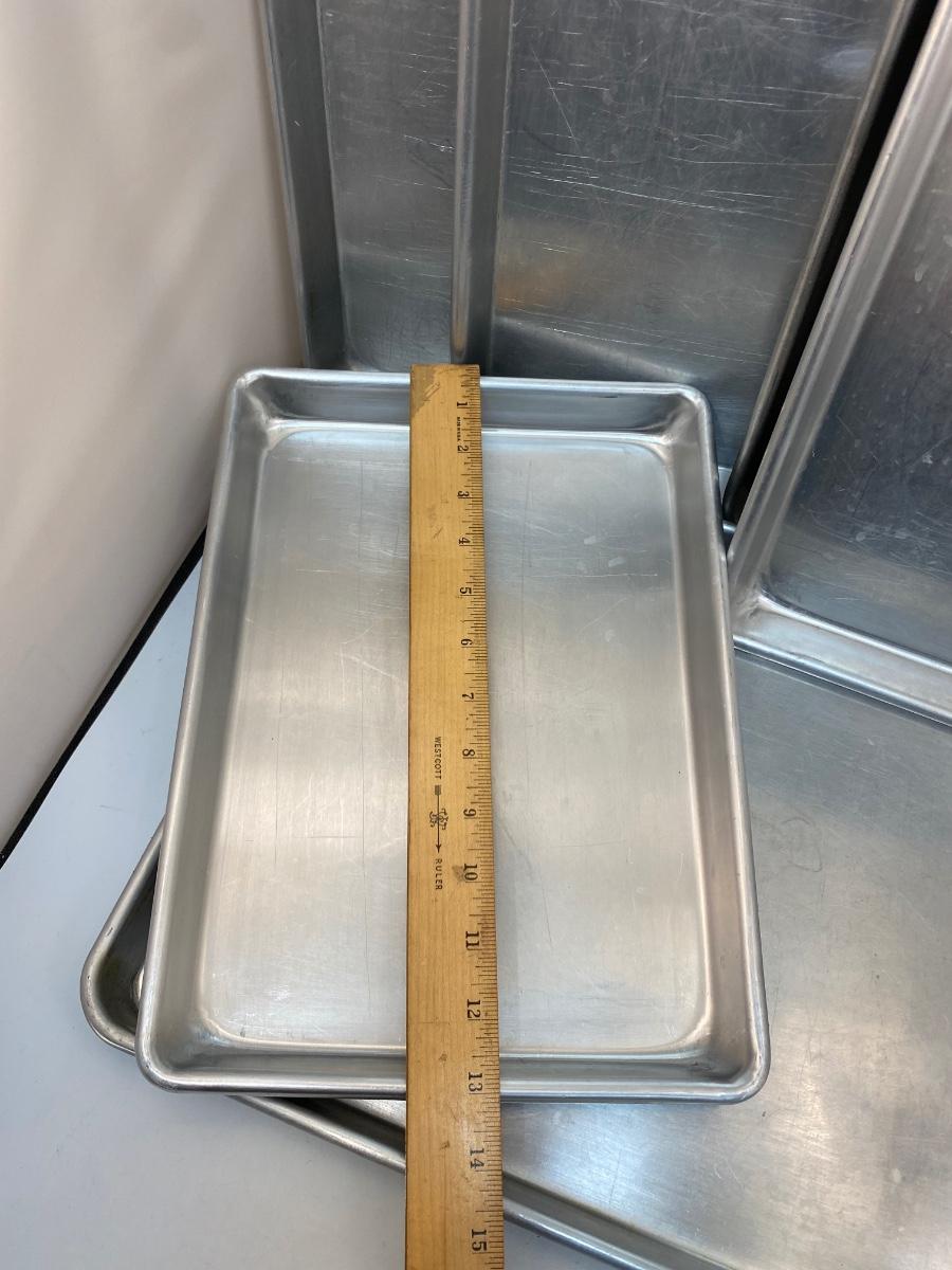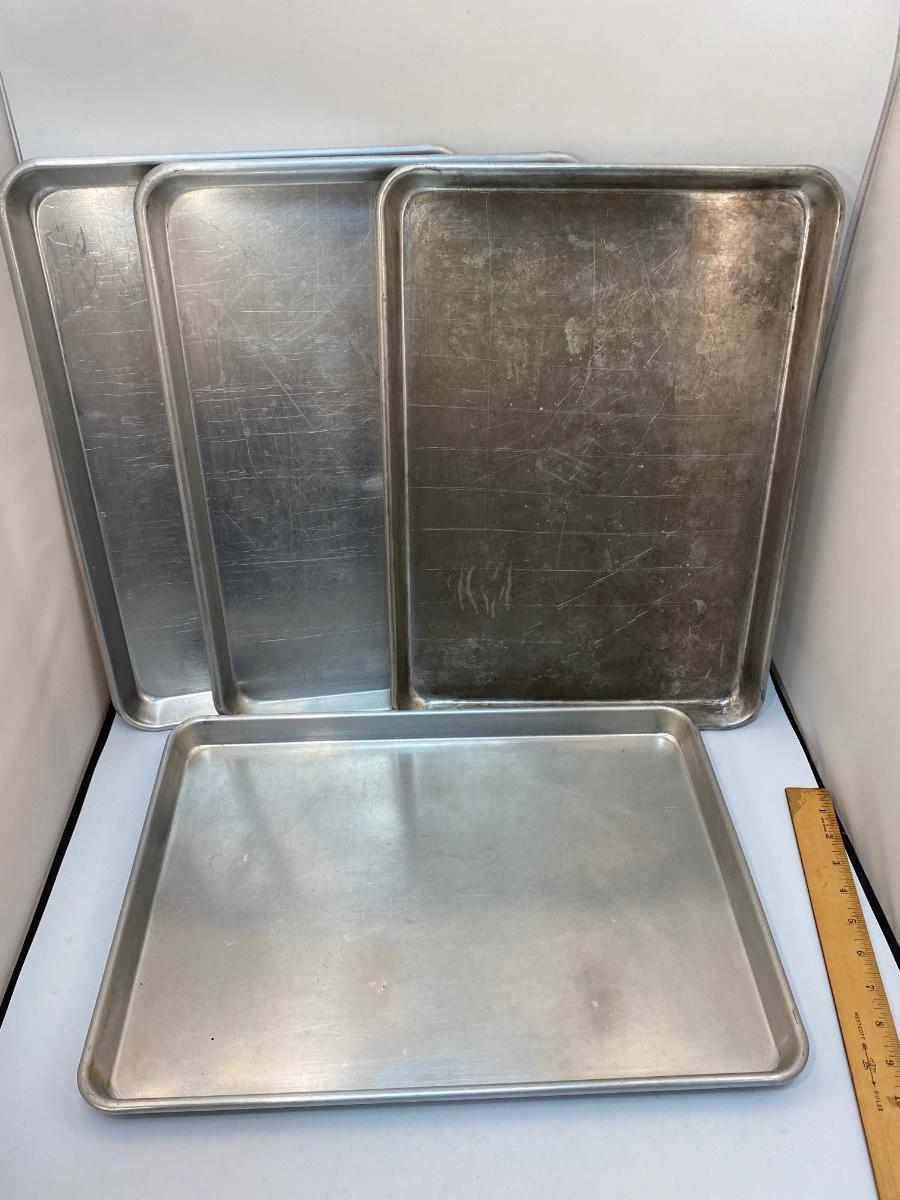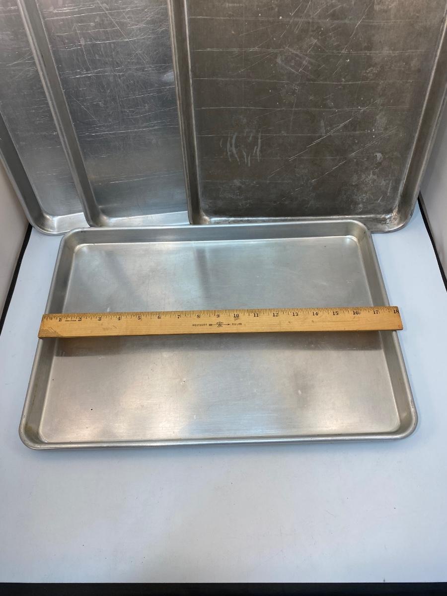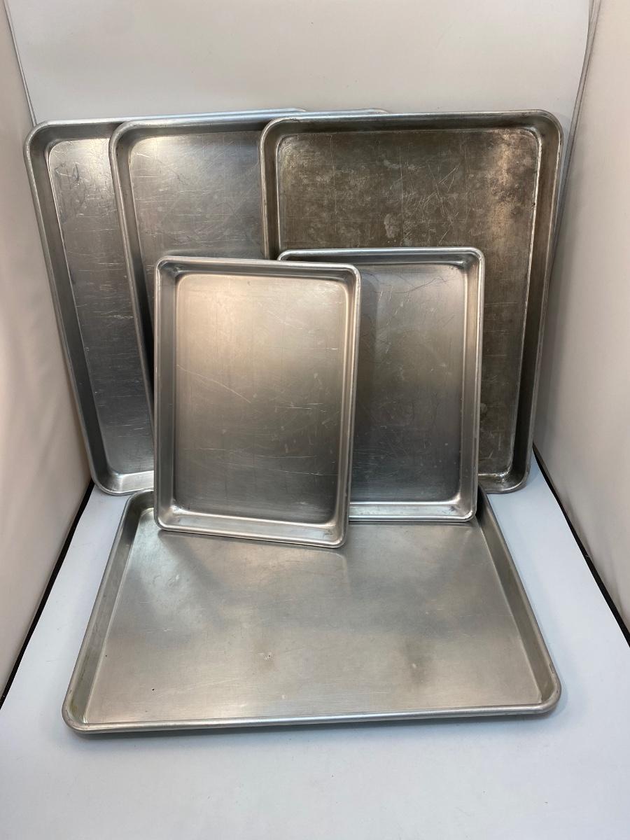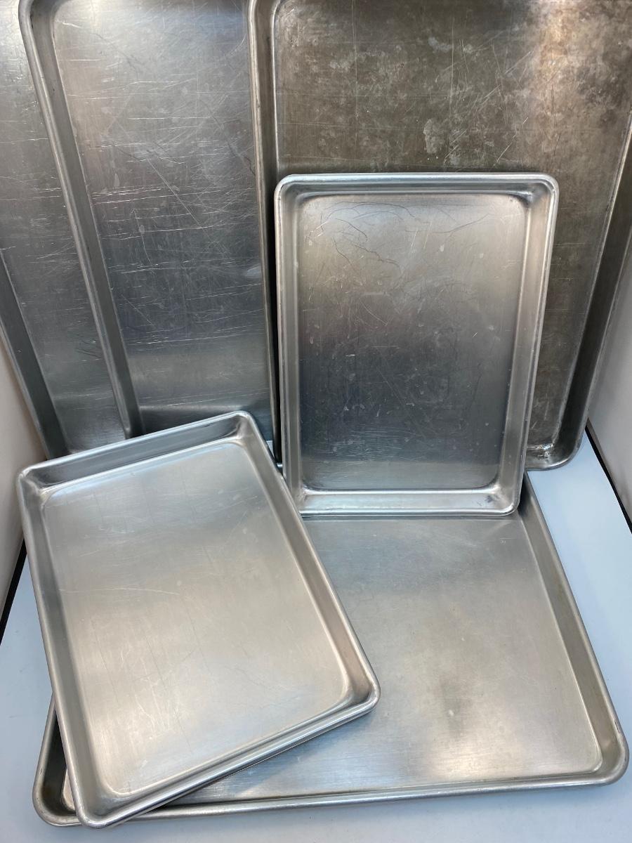 Set of 6 Shallow Cake Pans Cookie Sheets Bakeware. 4- 18" large pans and 2- 13" smaller pans. In good used condition.