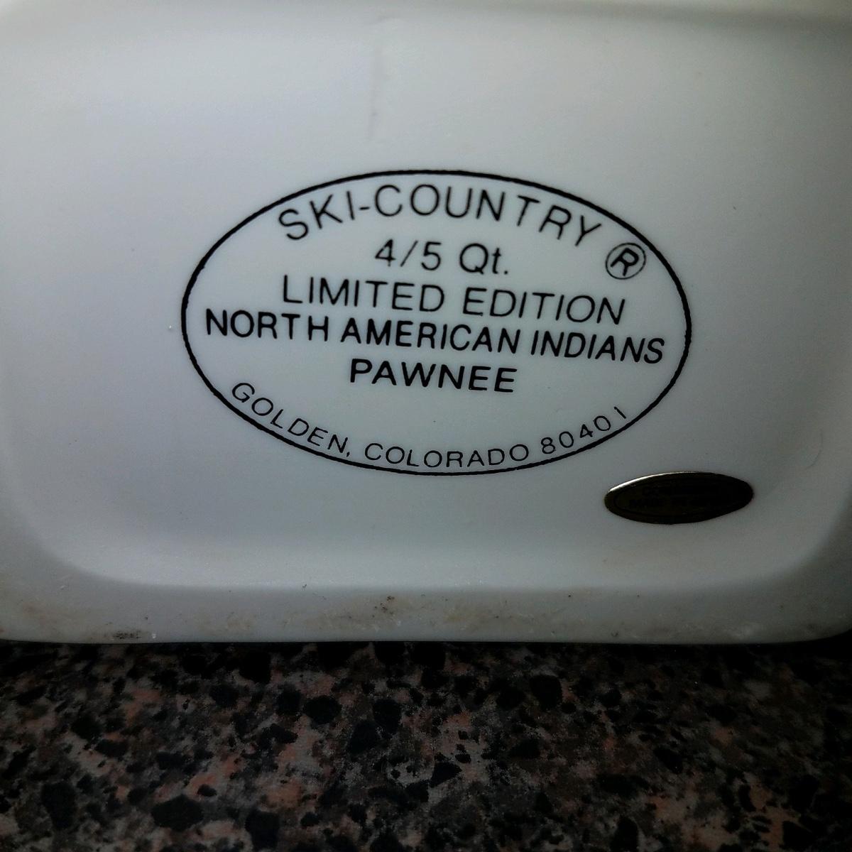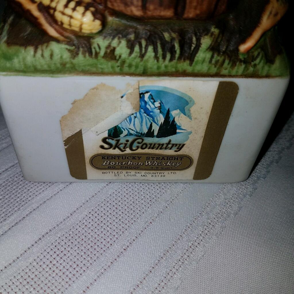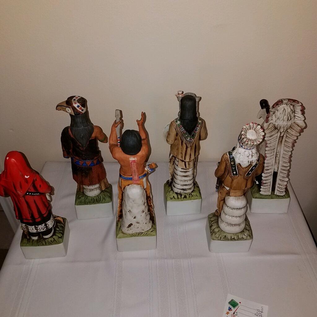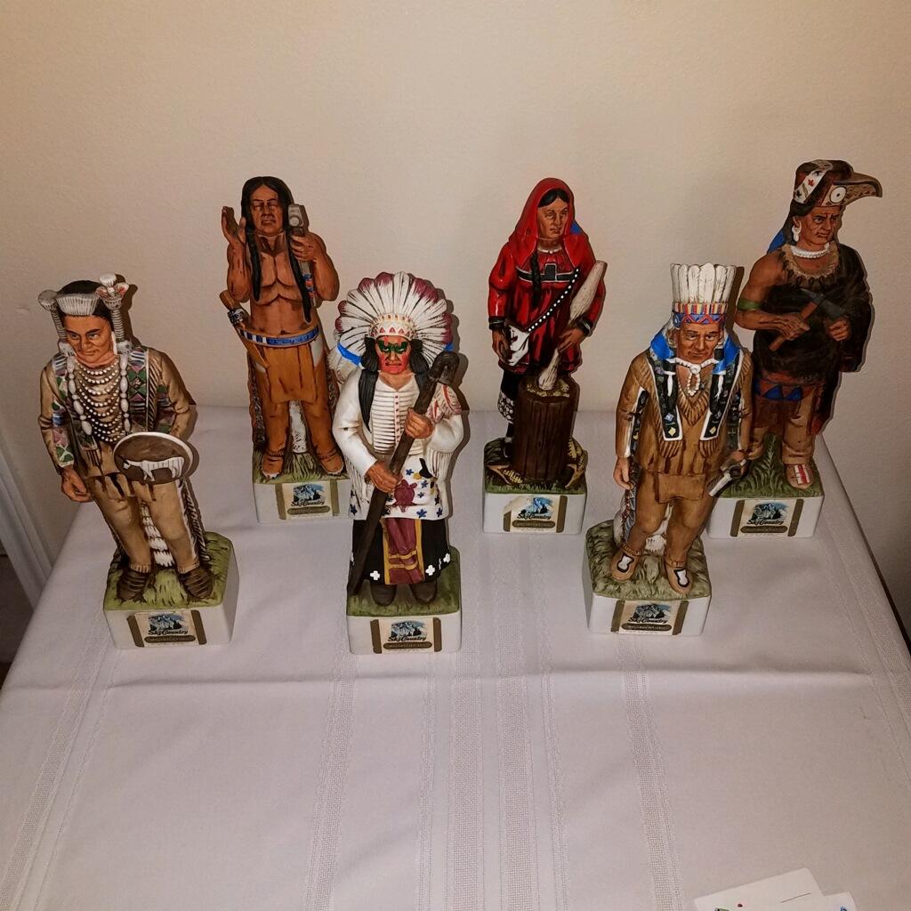 Set of 6 Ski Country Kentucky Straight Bourbon Native North American Decanters - empty. Approx 13” - 14” tall. Very good condition, one label partially torn. Slight paint wear on back of red Indian; some corks worn away due to age. Very nice set