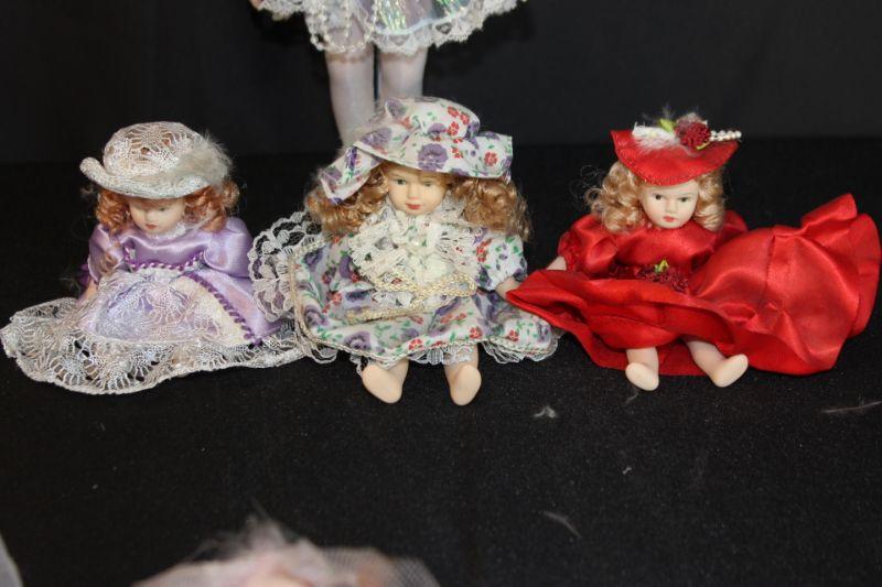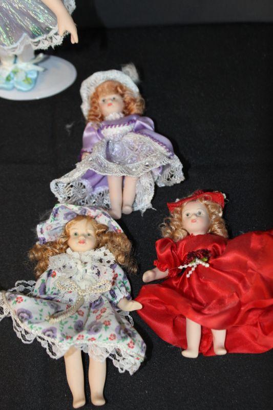 Set of 6 dolls. Jointed porcelain bodies. Unmarked. One comes with a stand.