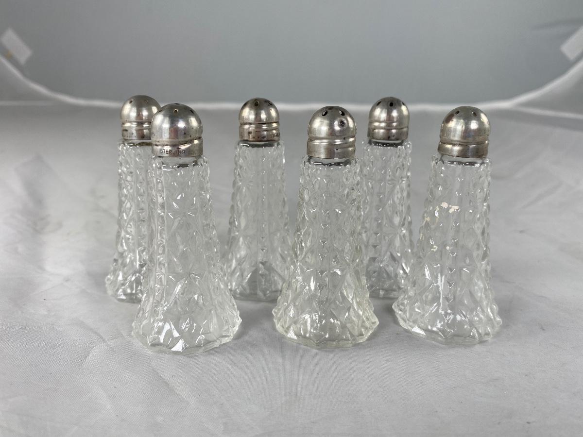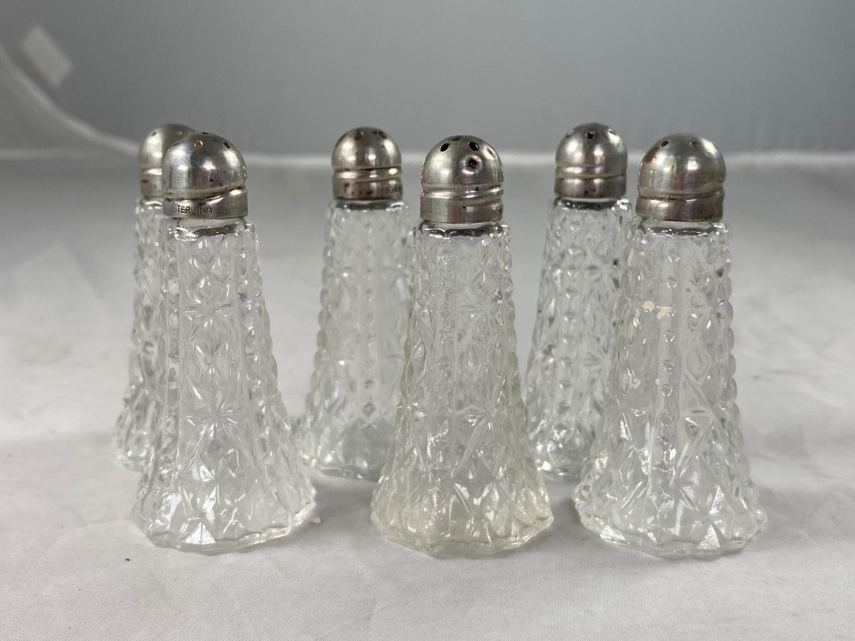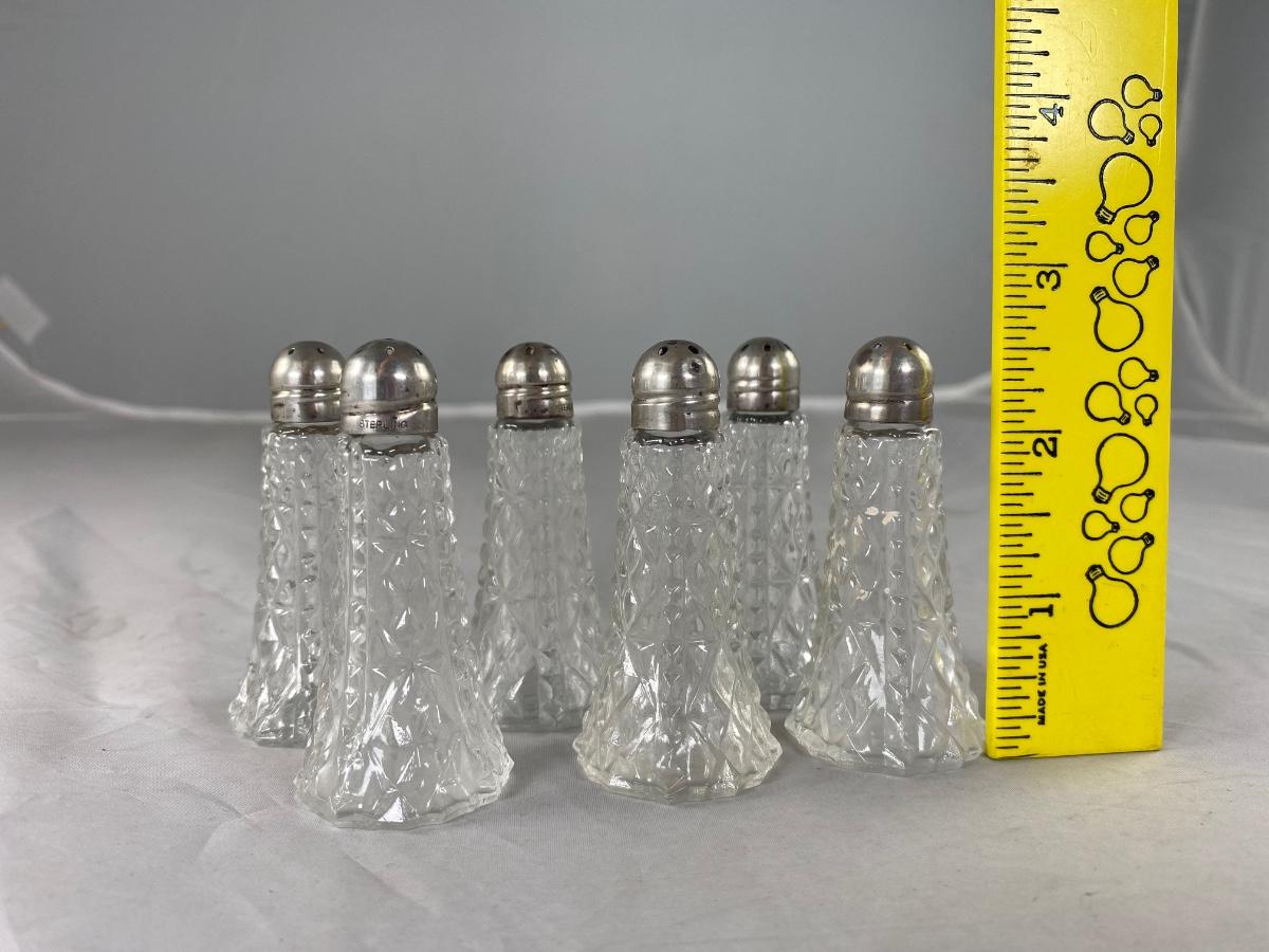 Set of 6 Small Vintage Pressed Glass Salt & Pepper Shakers with Sterling Silver Caps