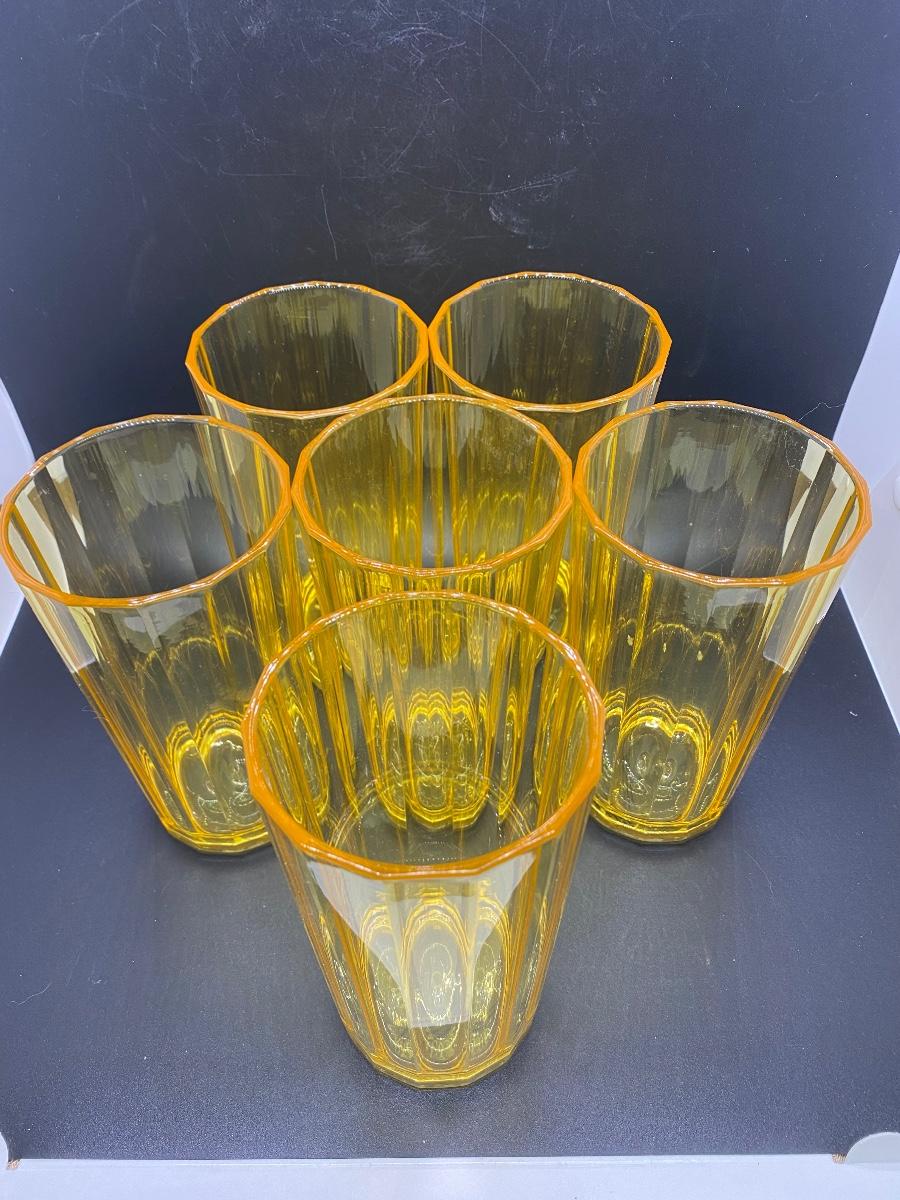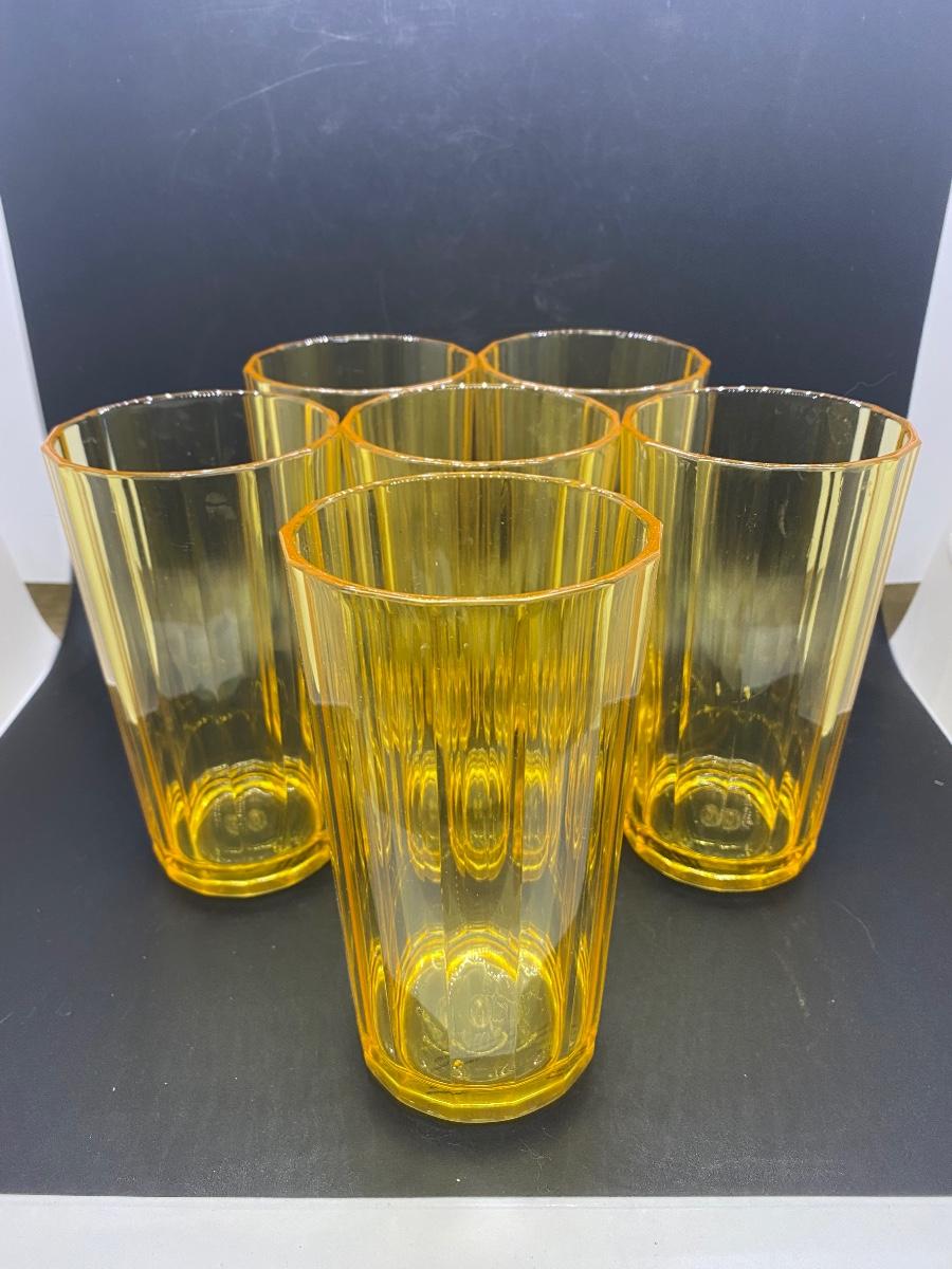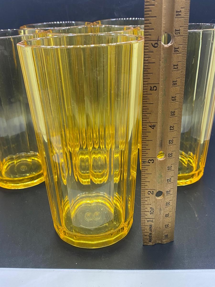 Set of 6 sunshine yellow plastic drink cups. Ribbed design, about 6" size. In good condition, possibly all are unused.