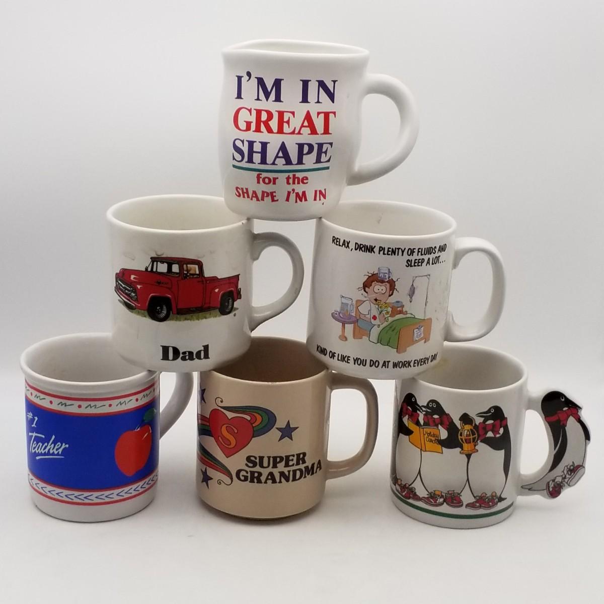 Set of 6 Vintage Ceramic Novelty / Theme Mugs: #1 Teacher Nurse Cartoon Quote Dad Red Truck 1980s 80's Super Grandma Rainbow Stars Heart Holiday Penguins Snarky