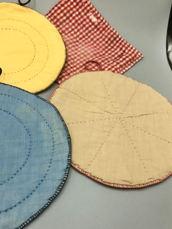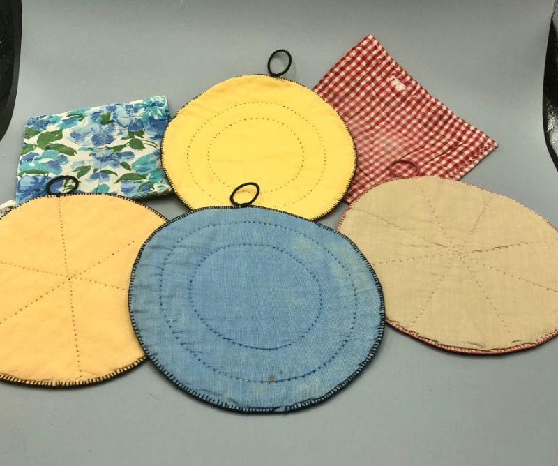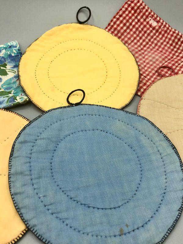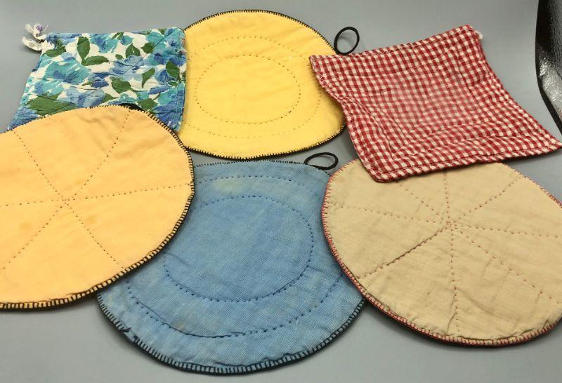 Set of 6 vintage pot holders. Previously owned and used. May be spots and discoloration from use/age.