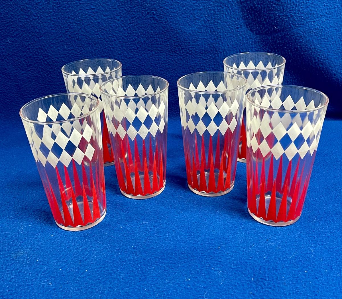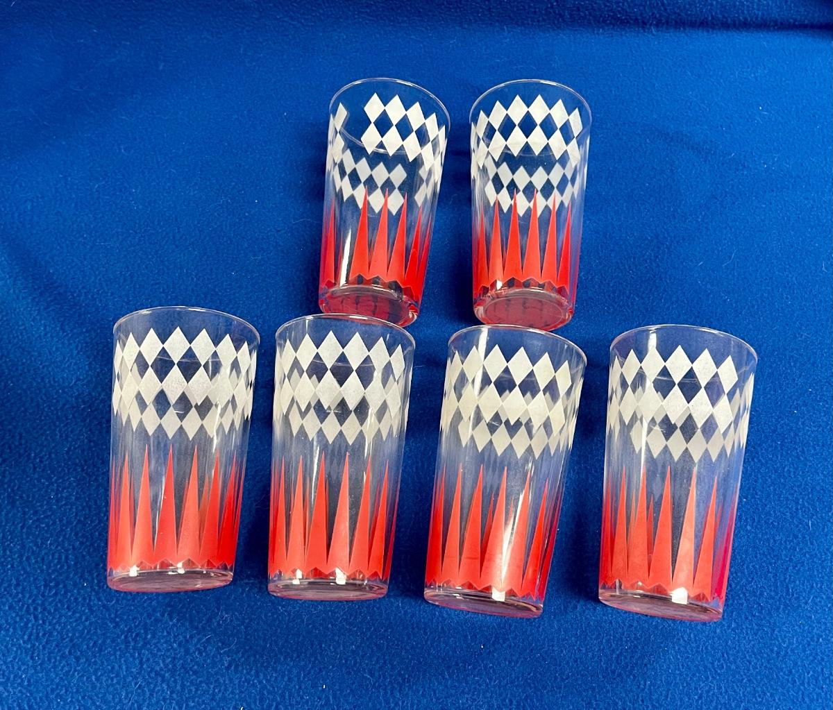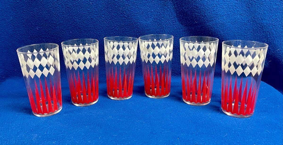 Set of 6 Vintage Retro MCM Midcentury Mod Red and White Geometric Print Drink Glasses