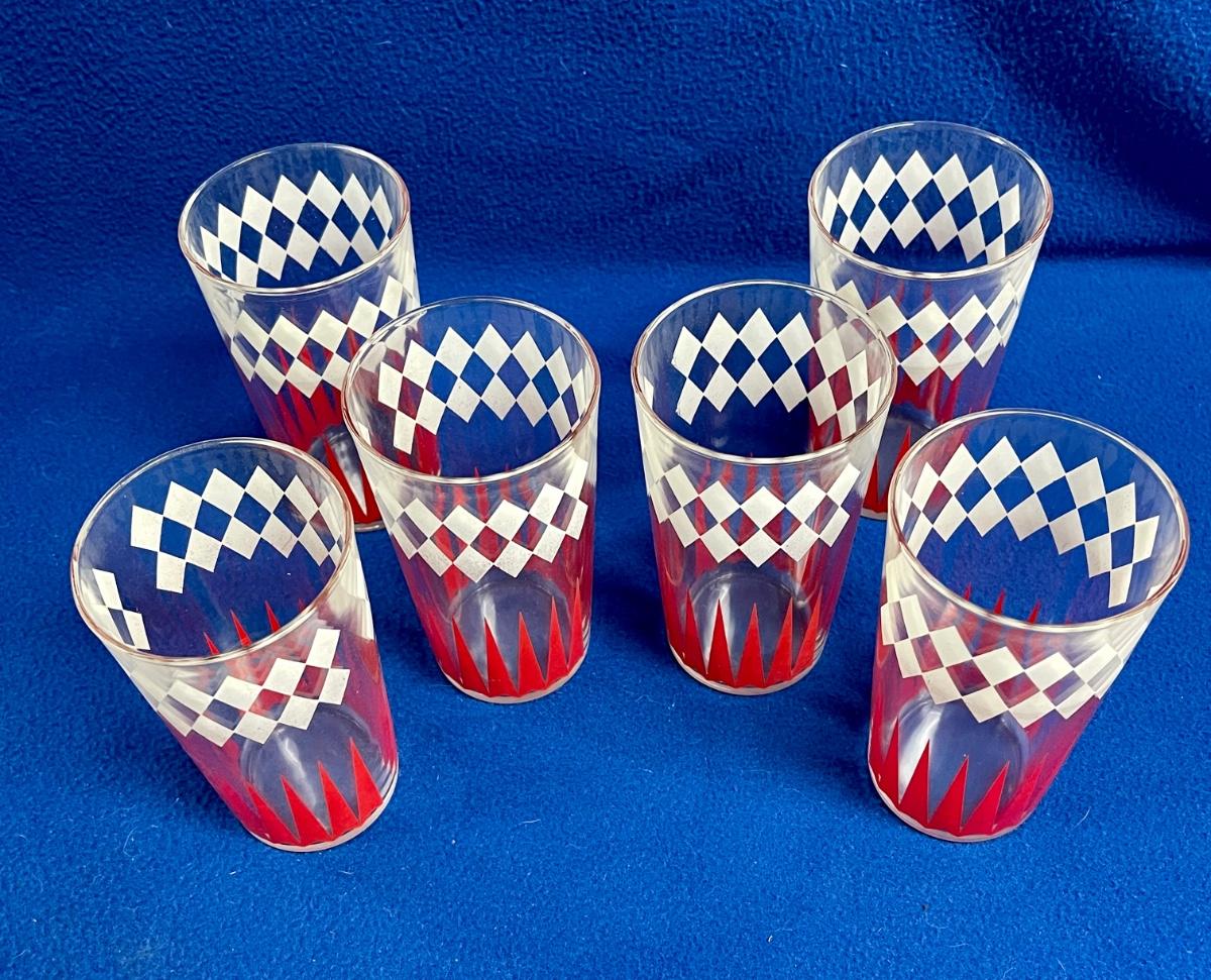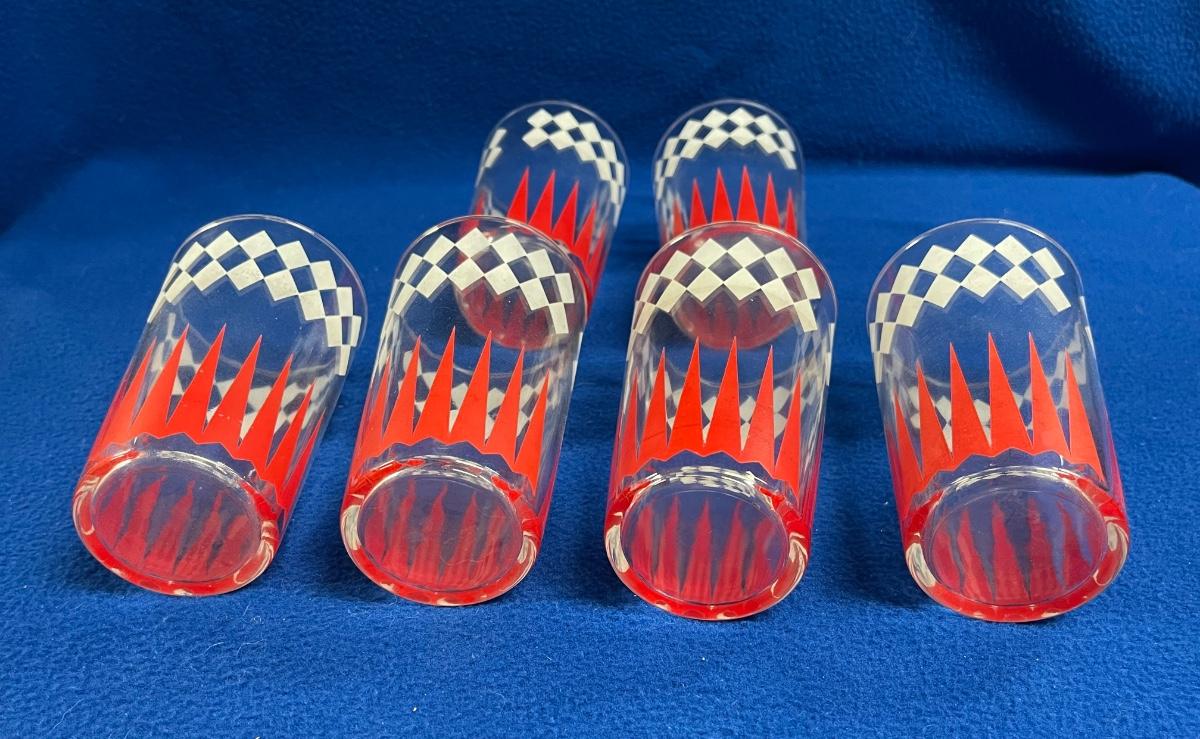 Set of 6 retro mod geometric drink glasses. Red and white design. About 5" size. In good condition.