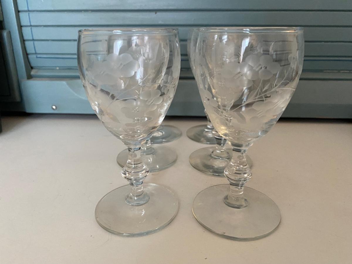 by Rock Sharpe cut crystal etched cordial glasses. 5”h