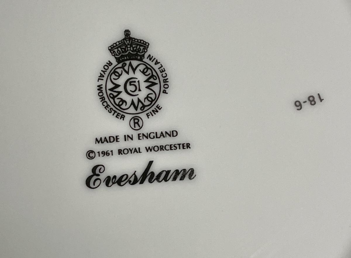 Set of 6 vintage 1961 Royal Worcester "Evesham" salad/dessert plates. Simple fruit patterned plates. In good condition.