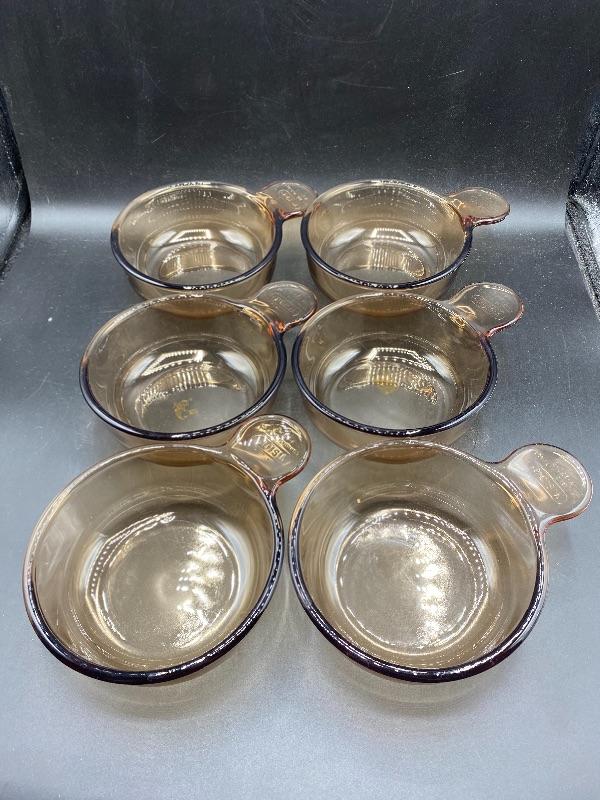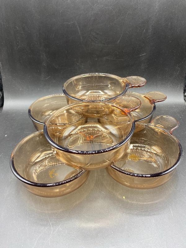 Set of 6 Vision Grab It single handle soup bowls. Made by Corning. Good Condition.