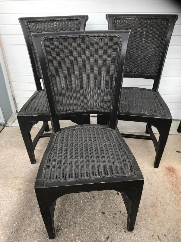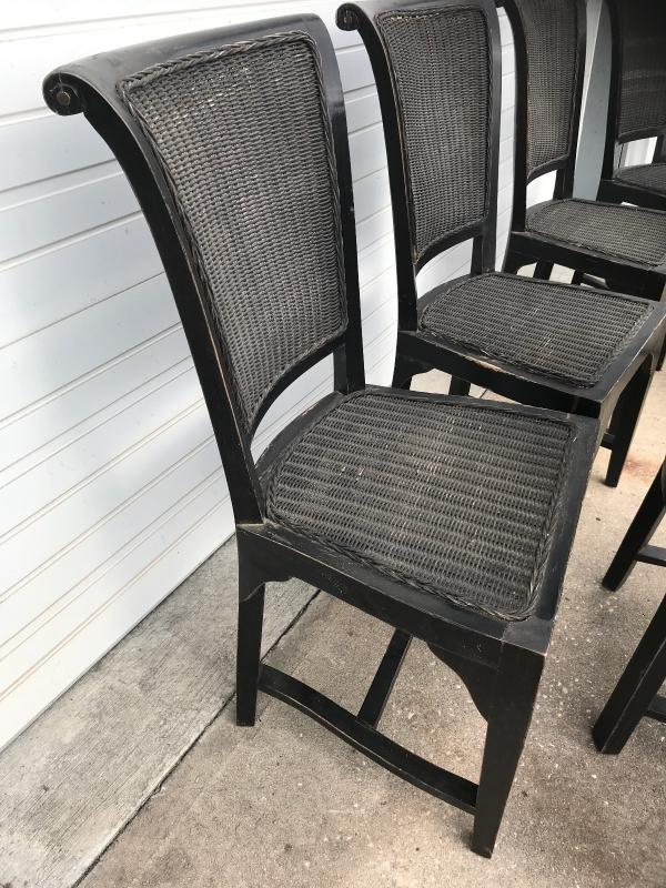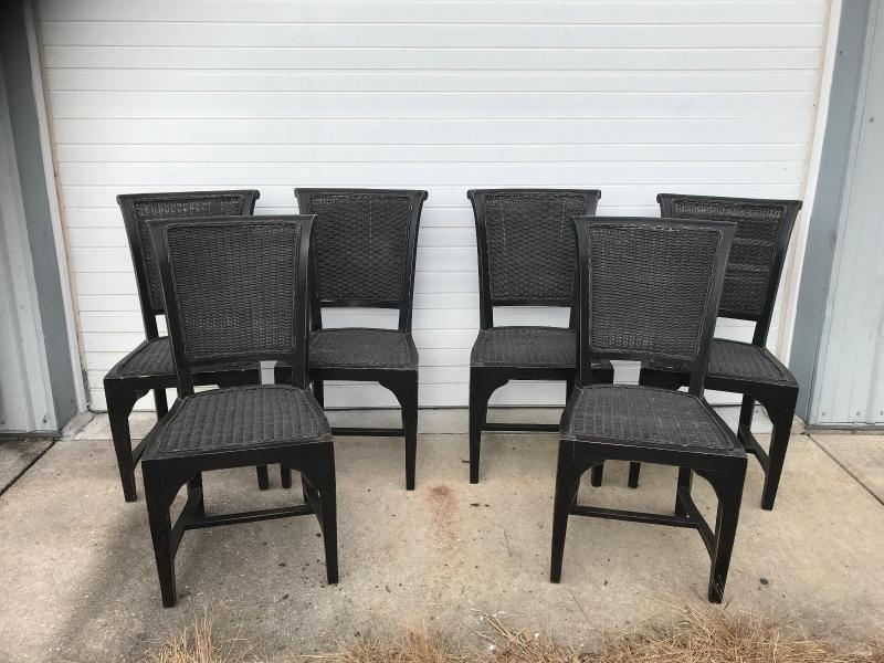 Up for Auction is a Set of 6 Wooden Wicker Chairs in fair condition. These chairs have been used outdoors on a porch. Could use some light sanding and TLC and they would be great.