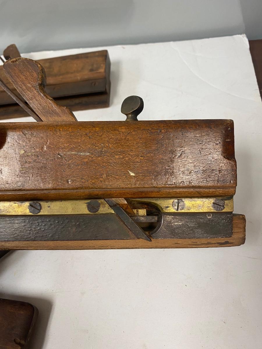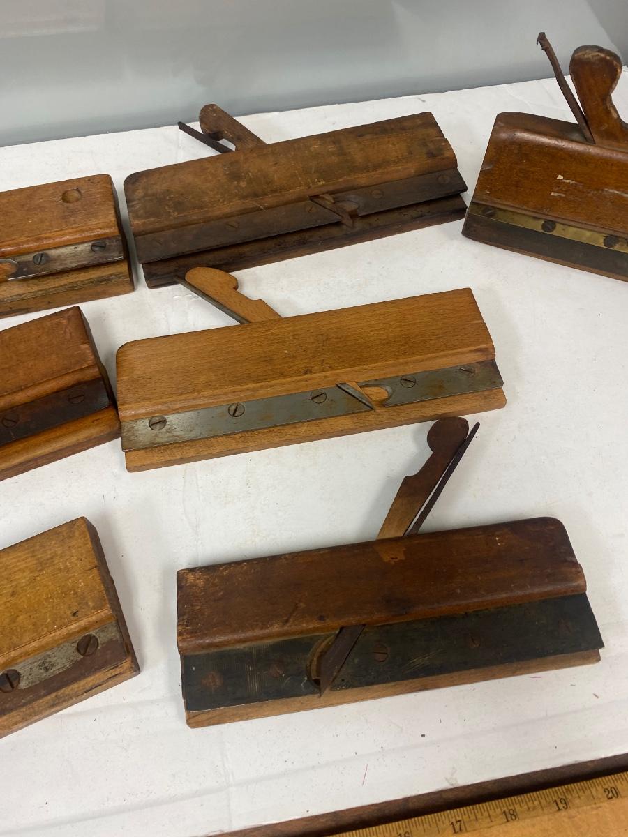 Set of 7 Antique Wood Tongue & Groove Moulding Planes Various Sizes. In good antique condition. Various blade sizes. Adjustable plates. Most seem to be stamped with names, previous owners or makers and size.