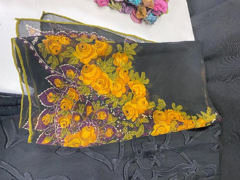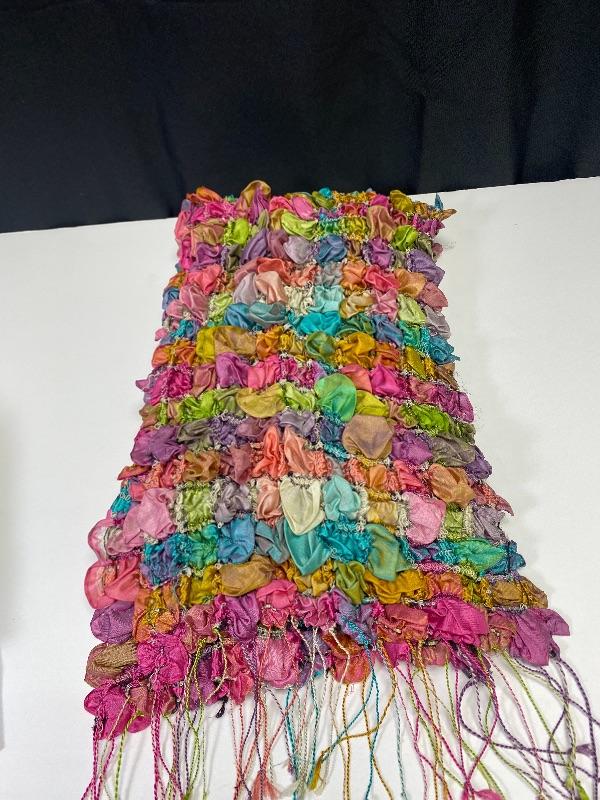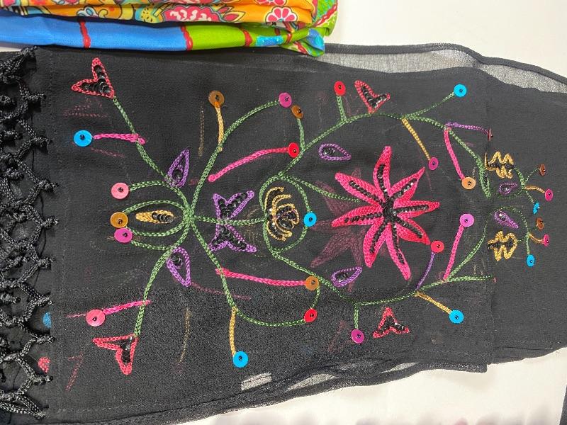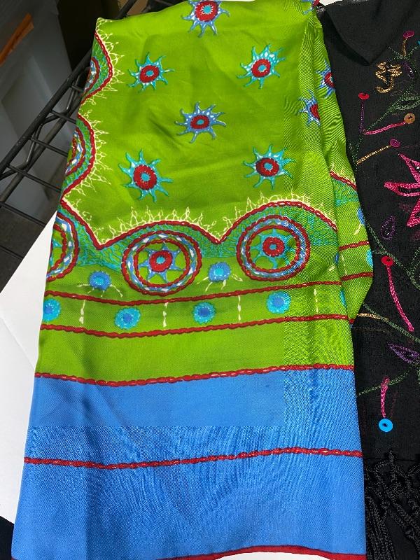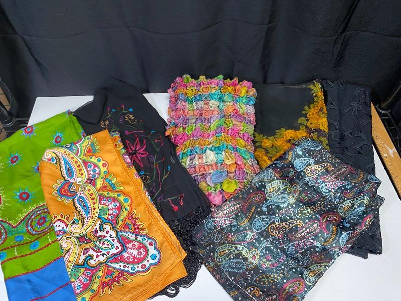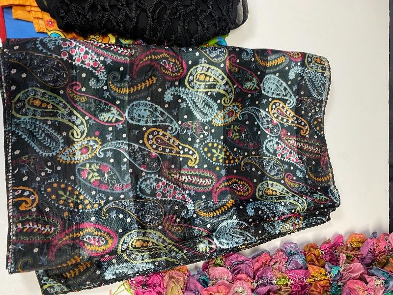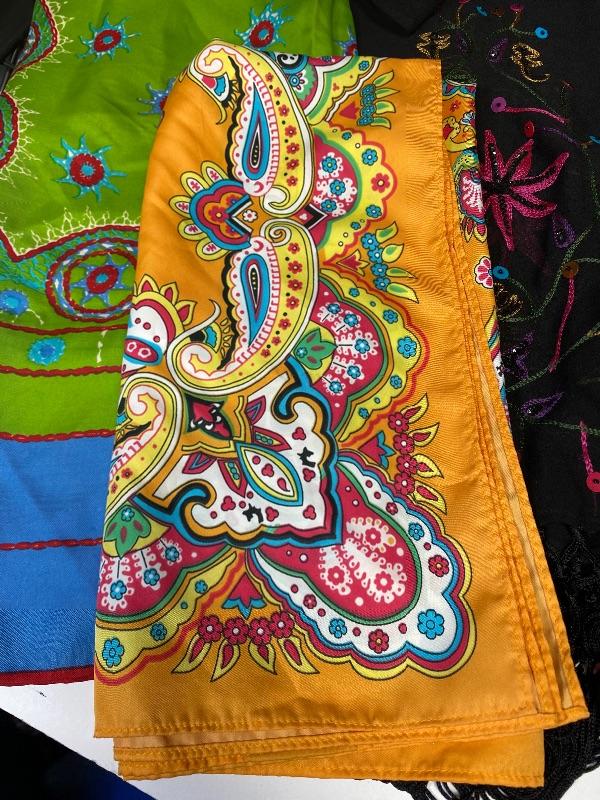 Set of 7 scarfs. Various sizes, similar bright colors and black. The multi checkered scarf is kinda puffy stretch fabric. Previously owned conditions